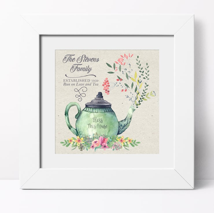 A fabulous gift for a family, and perfect for tea drinkers! This 'Love and Tea' print is personalised with your family name and year, and the words 'run on love and tea'. Featuring hand painted illustrations, this pretty floral teapot print will look beautiful displayed anywhere in your home, especially the kitchen!