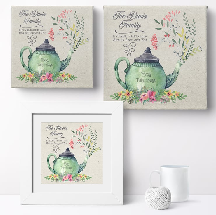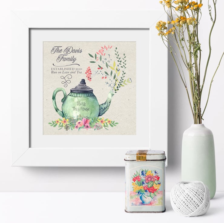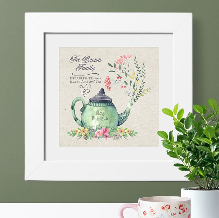 The charming floral design features a textured effect background and lots of soft colour. A perfect family gift for a housewarming, Mother's Day, or birthday, and a lovely finishing touch for your own home. Celebrate the comforting blend of love and tea with this charming personalised print.