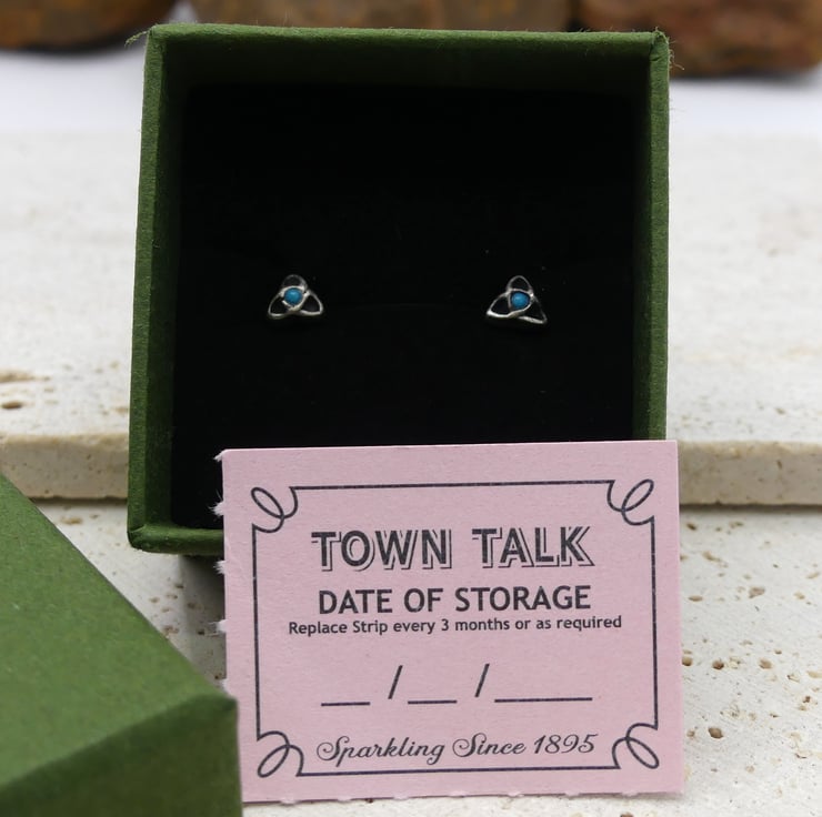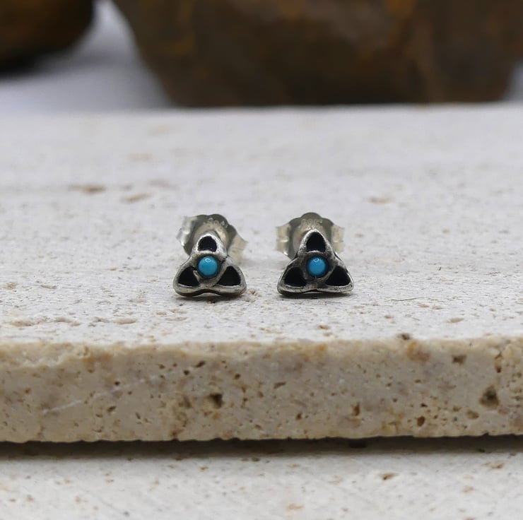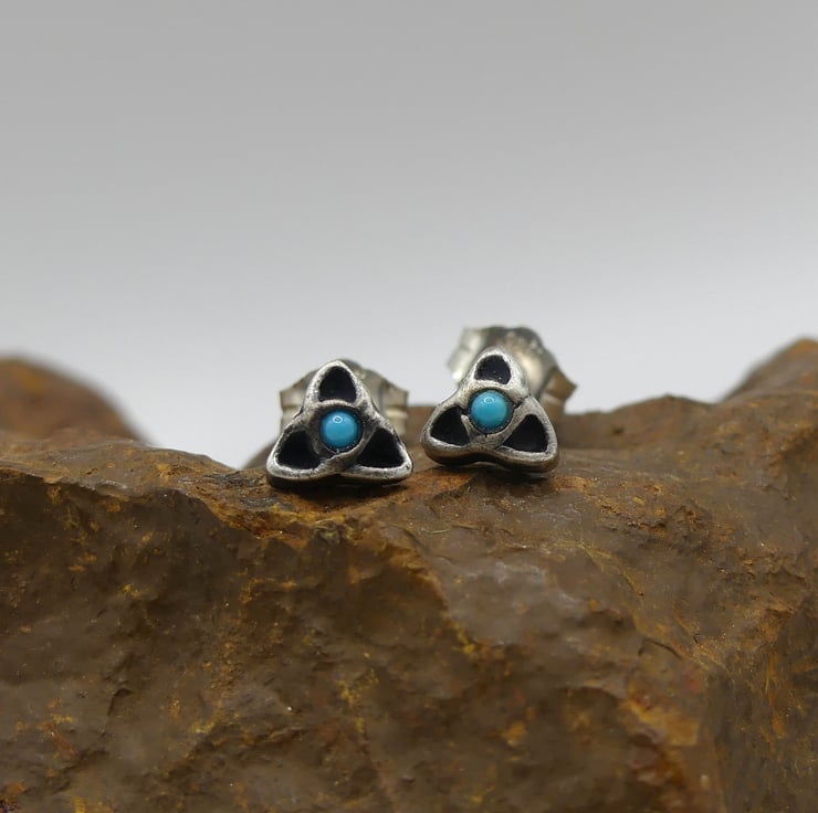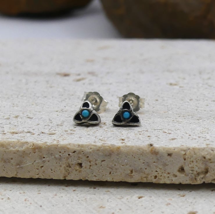 Recycled Sterling Silver Triquetra Stud Earrings with 1.5mm Turquoise Gemstones.