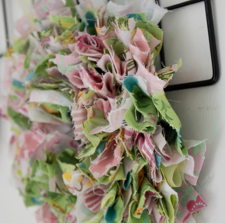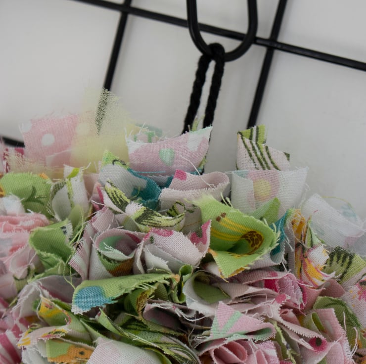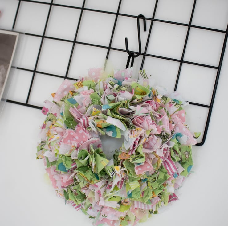 Mini version of my hand crafted rag rug wreath made from hessian and pink and green spring inspired scrap fabric. Backed in simple green felt and finished with a hanging loop. Ideal as wall hangings but can also be used as table decorations