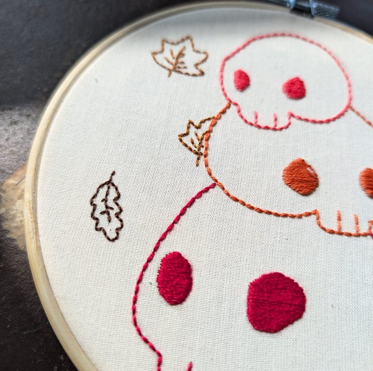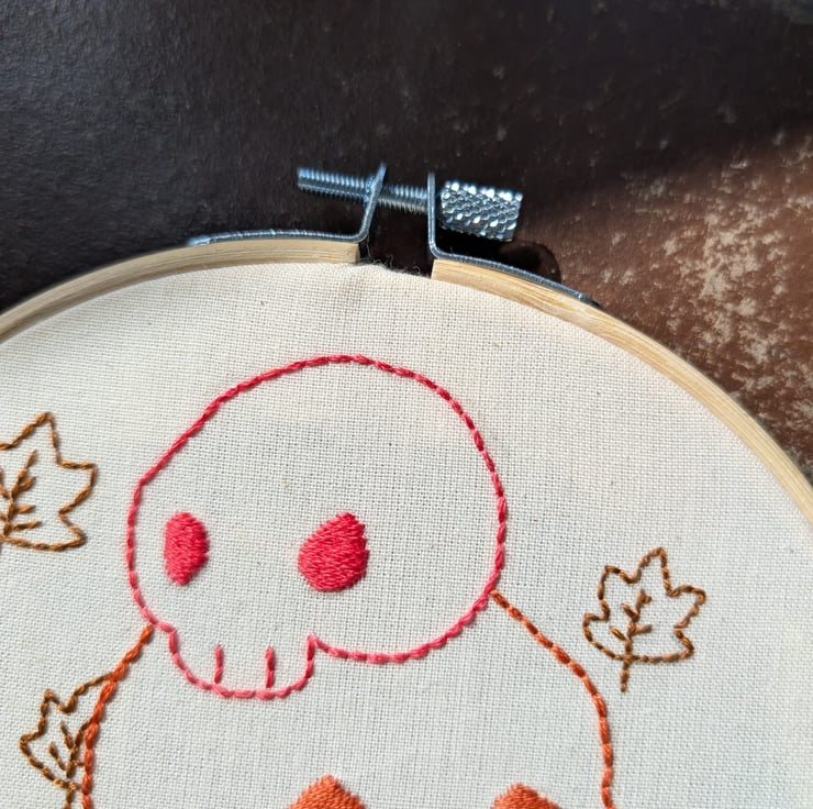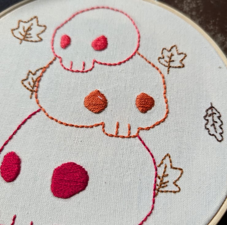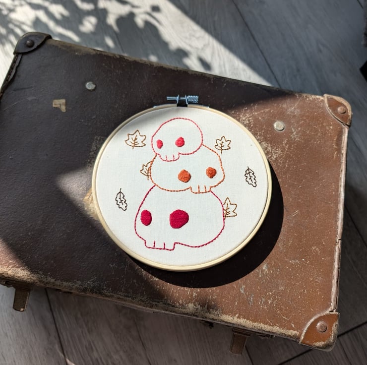 Hand embroidered hoop featuring autumnal, halloween inspired skull pile with falling leaves . Simply stitched on a calico cotton background for a cute and spooky little wall hanging!
