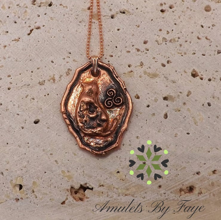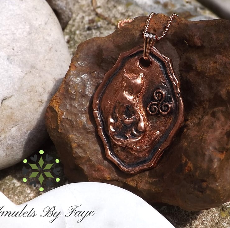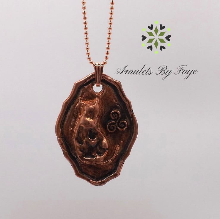 Recycled Copper Cat on Picture Frame Pendant with Triple Spiral, Necklace.