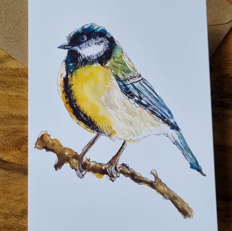 This greeting card of a Great Tit is a print from my original artwork using watercolour and ink. It is blank inside for your own personalised message.