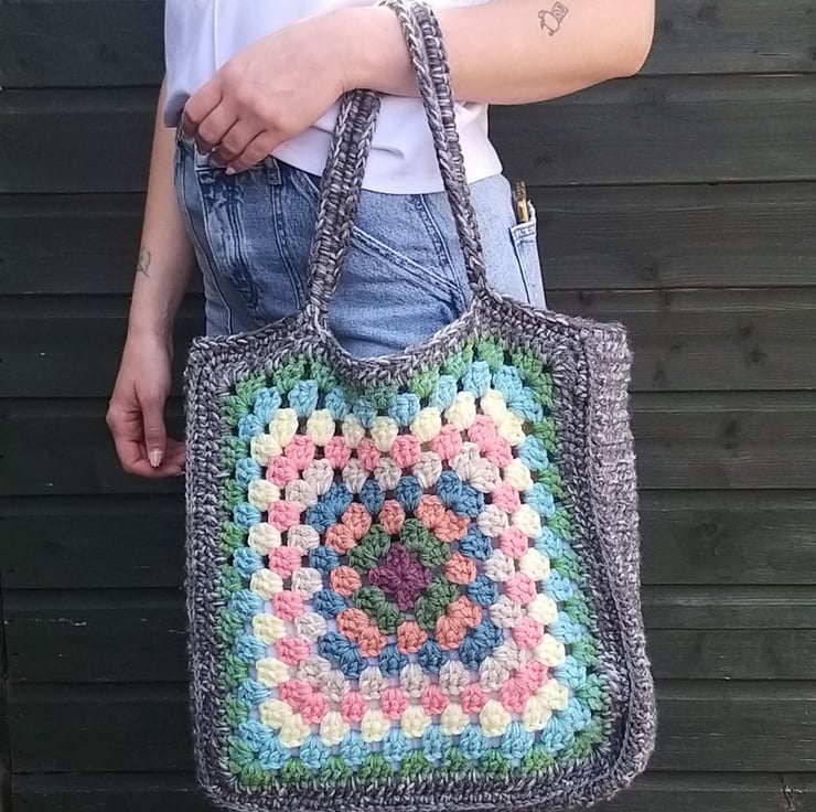 The giant granny squares used to make this bag are made with a jumbo sized hook and 4 strands of yarn held together. This supersizes the humble granny square and makes a bag that is brilliantly strong and will keep it's shape.