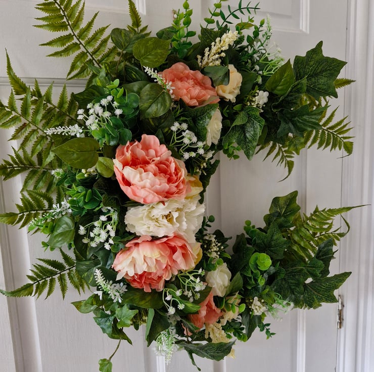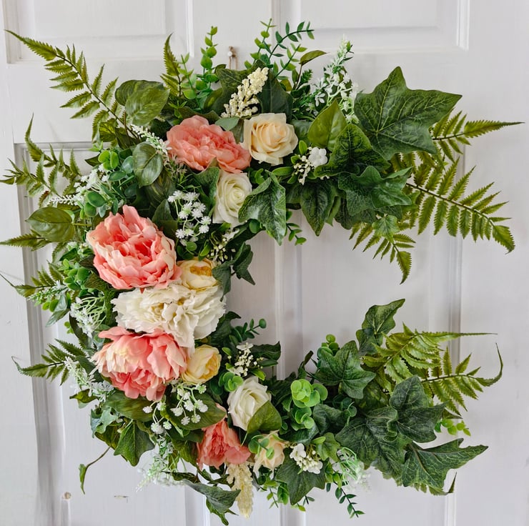 Beautiful large premium crescent shape hanging wreath bursting with mixed lush green foliage, peonies,roses,white lavender, gypsohilia & lilac.