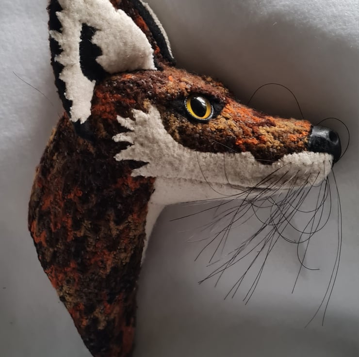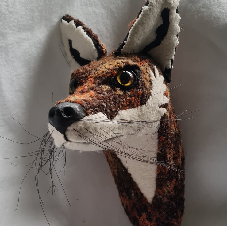 A lifesize faux fox head which I have handmade and covered in hand stitched tweed fabric. The cream wool fabric is upcycled from a vintage Welsh blanket. The nose is handmade from polymer clay. The head is backed with felt and has a metal hanger to hang it on the wall. It is lightweight.