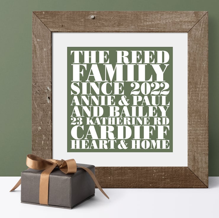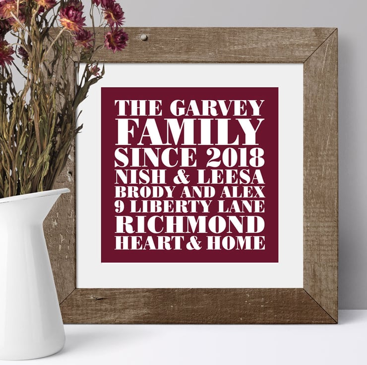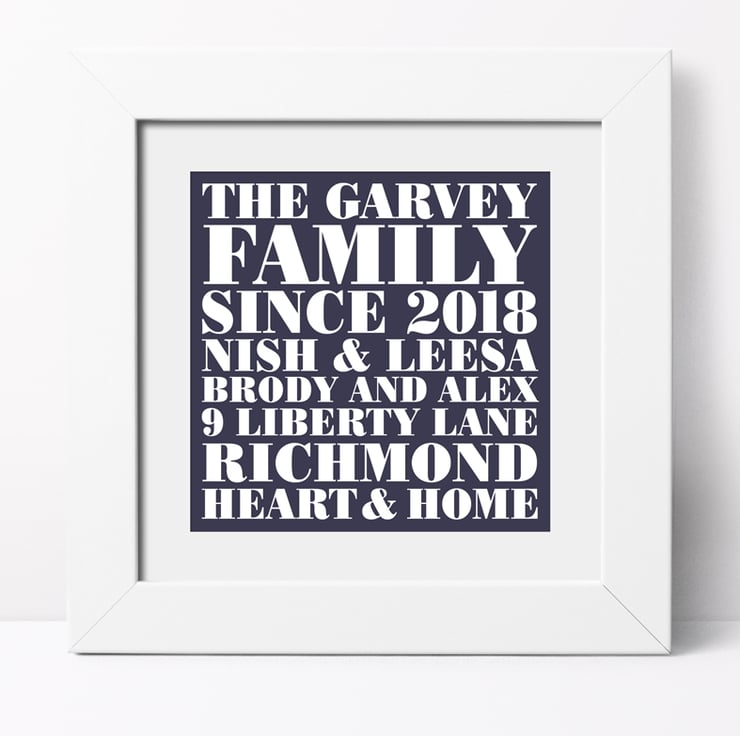 This stylish Heart and Home print is personalised with all your key family details and created for you in absolutely any colour you like. Whether you want it in simple black and white, soft pastels, or something bright and striking, this contemporary design will look incredibly stylish in your home. Completed with the words 'heart and home', this lovely print will look great in any setting.