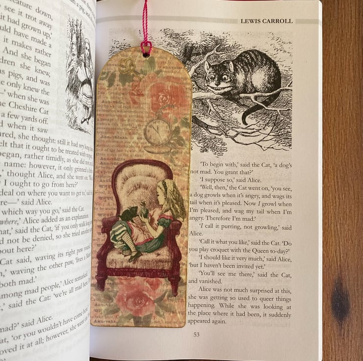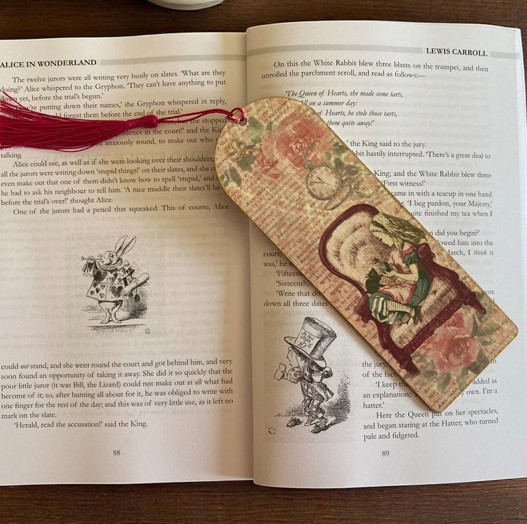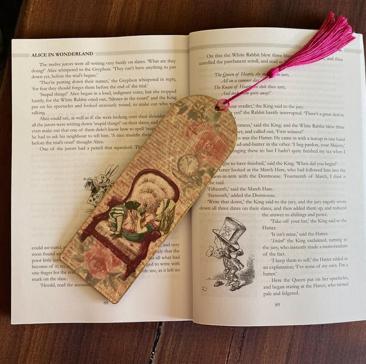 Wooden decoupage bookmark, featuring Alice in Wonderland. Made from 2mm MDF, the bookmark is lightweight, durable, and perfect for book lovers. Each one is carefully decorated using the decoupage technique. Approxmately 17.5 x 6cm x 2mm.