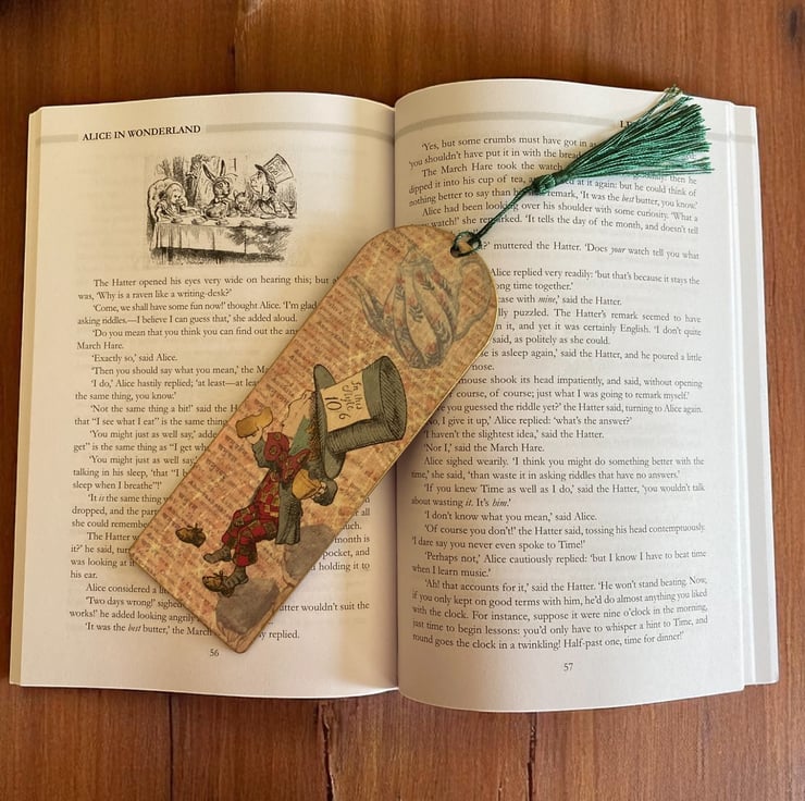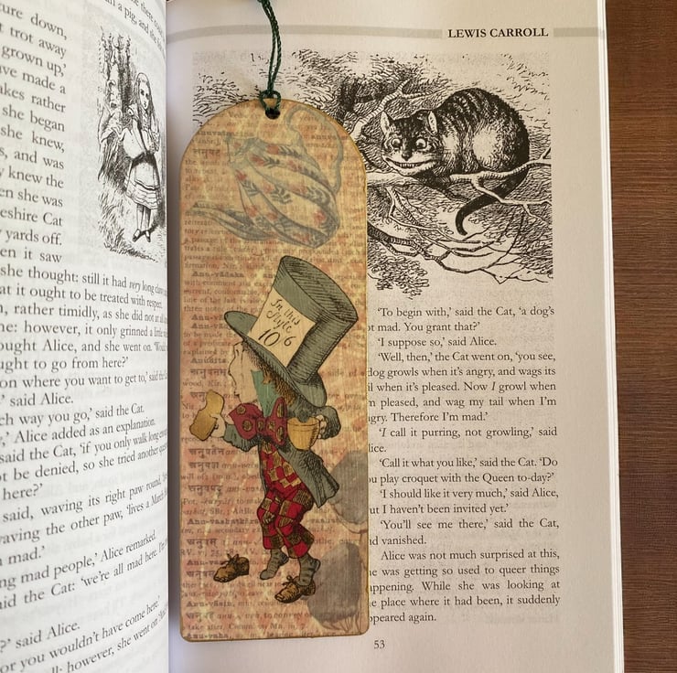 Wooden decoupage bookmark, featuring the Mad Hatter from Alice in Wonderland. Made from 2mm MDF, the bookmark is lightweight, durable, and perfect for book lovers. Each one is carefully decorated using the decoupage technique. Approxmately 17.5 x 6cm x 2mm.