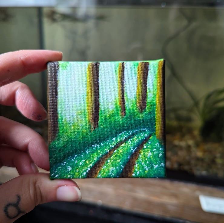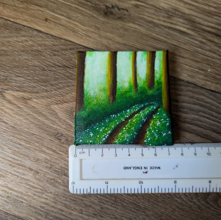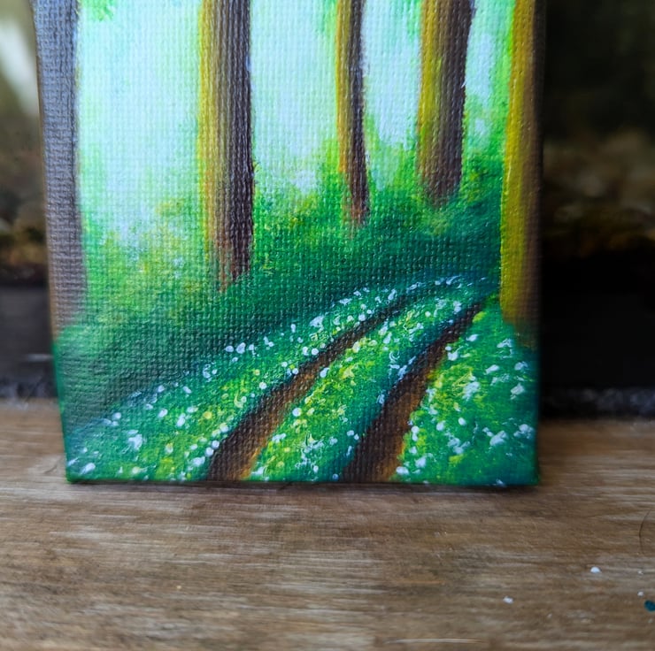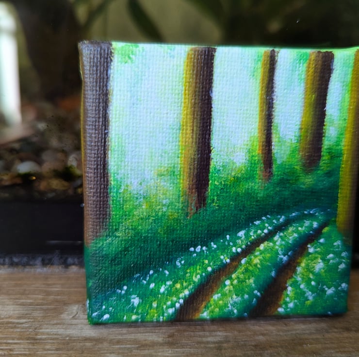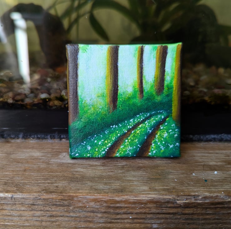 An approx 7cm x 7cm, mini painting of a pathway through a dimly lit woodland trail, with trailing white flowers.