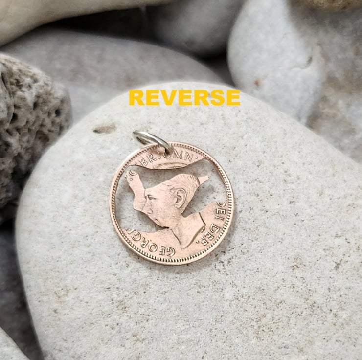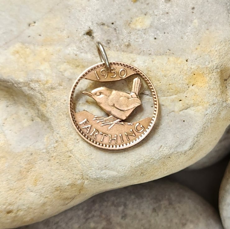 A 1950 bronze farthing with the hand-pierced outline of the wren on the reverse side. Ideal as a present for someone who is 75 this year. The piercing is done with a fine-bladed jewellers saw, it is NOT laser cut. 2cms across. Finished with a sterling silver chain, 16 or 18inch, you choose.