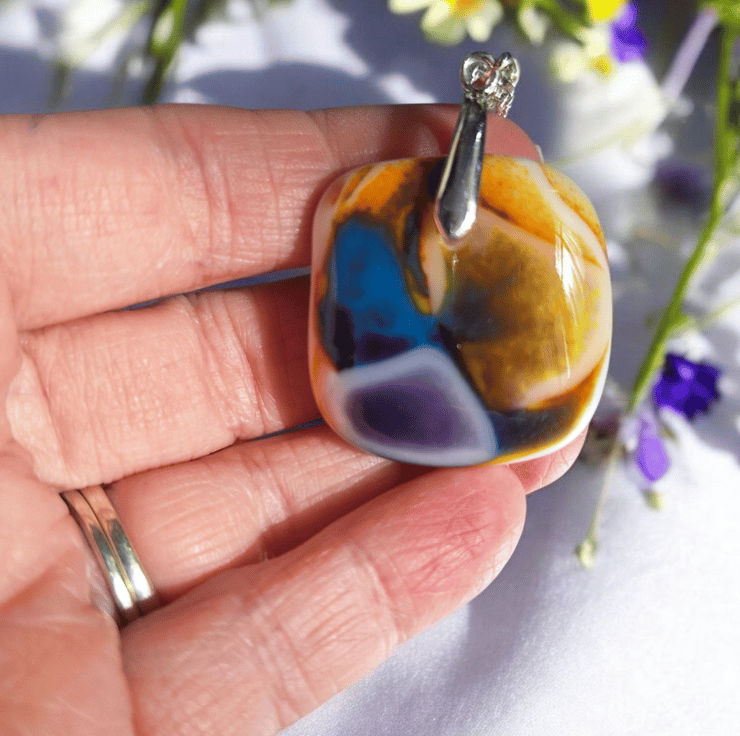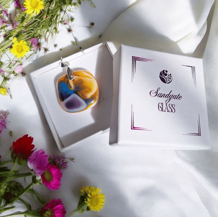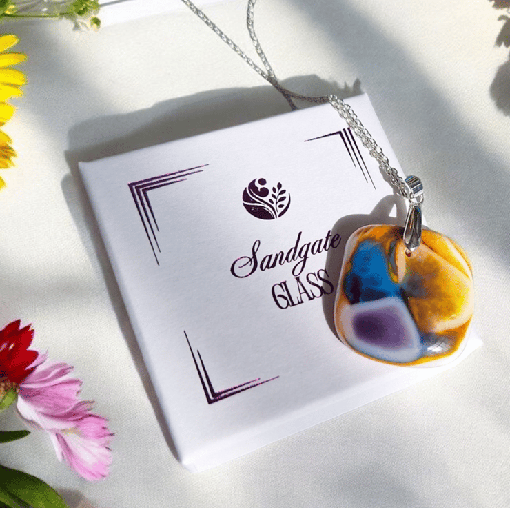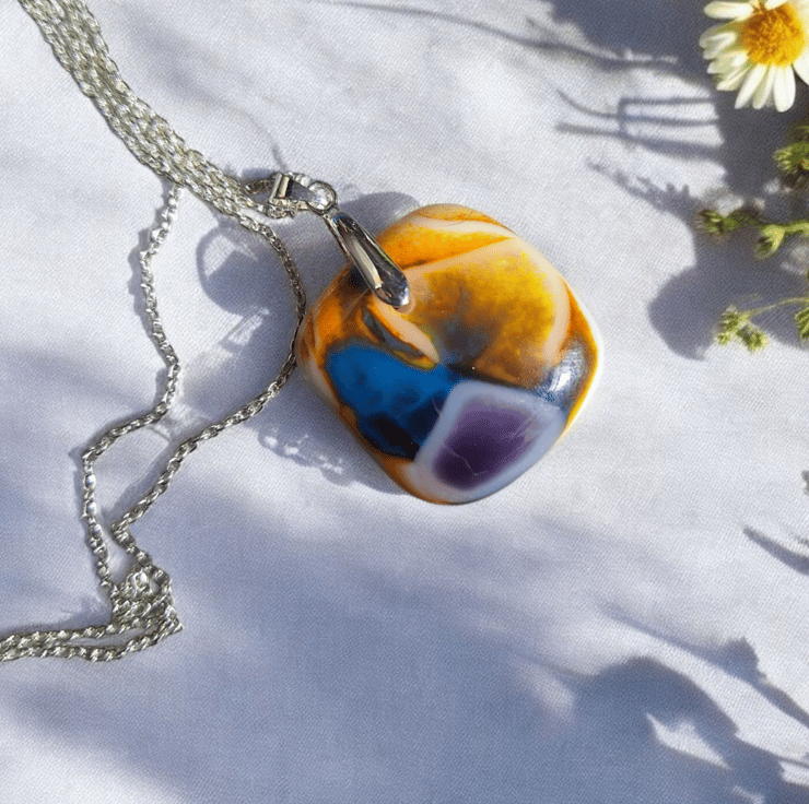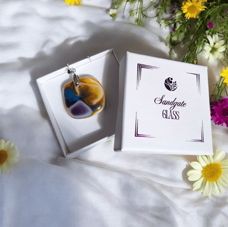 Bring a burst of colour to your jewellery collection with this handmade fused glass pendant, created in my home studio in Blackpool. This unique design features swirling shades of yellow, purple and blue, carefully layered and kiln fired into a 3 cm square pendant. Each piece is shaped and smoothed by hand and finished with a silver plated pinch bail.
