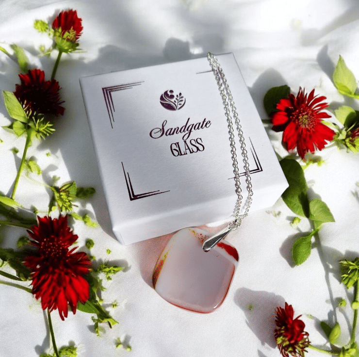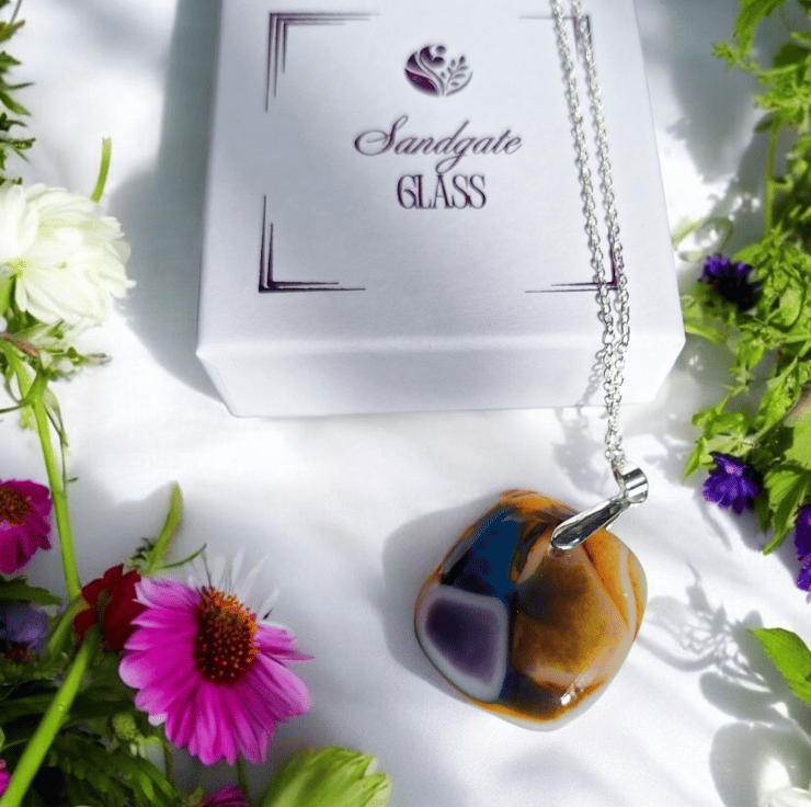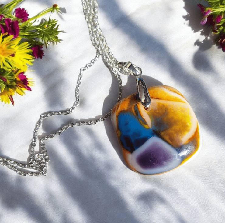 This pendant is a little piece of wearable art and a true one of a kind. Every piece I make is slightly different, reflecting the handcrafted nature of kiln formed glass.