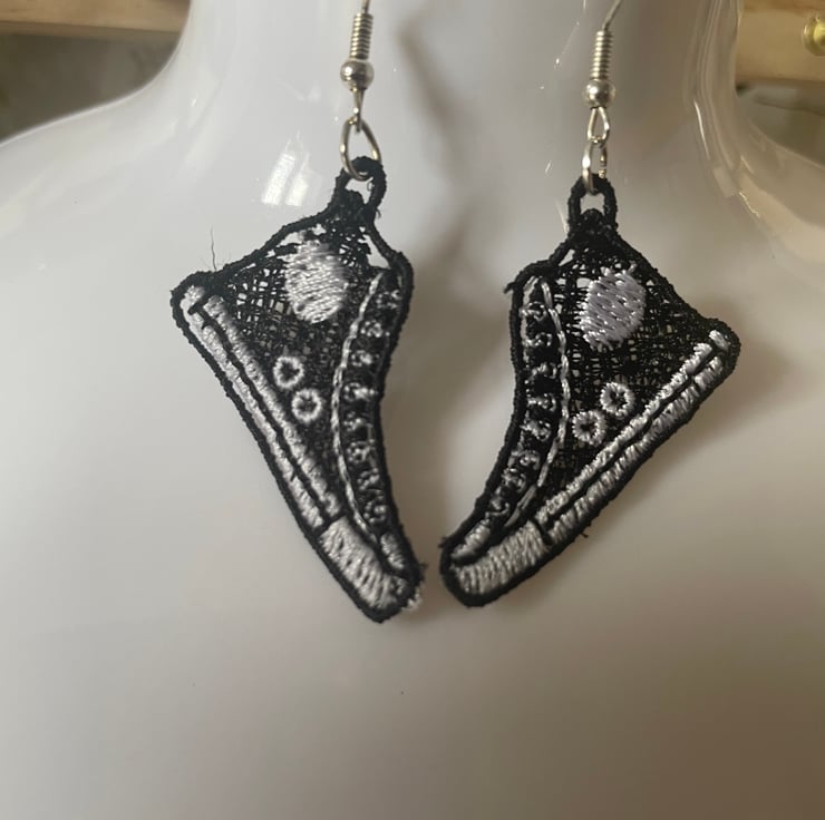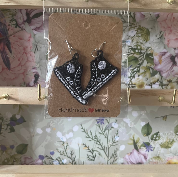 These elegant lace earrings are a unique handmade accessory crafted using an embroidery sewing machine for a detailed and delicate finish