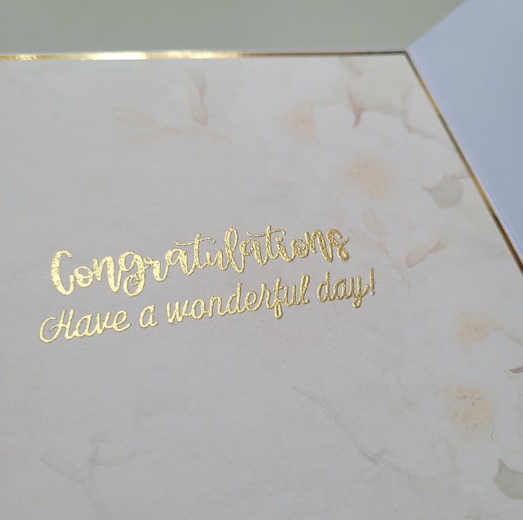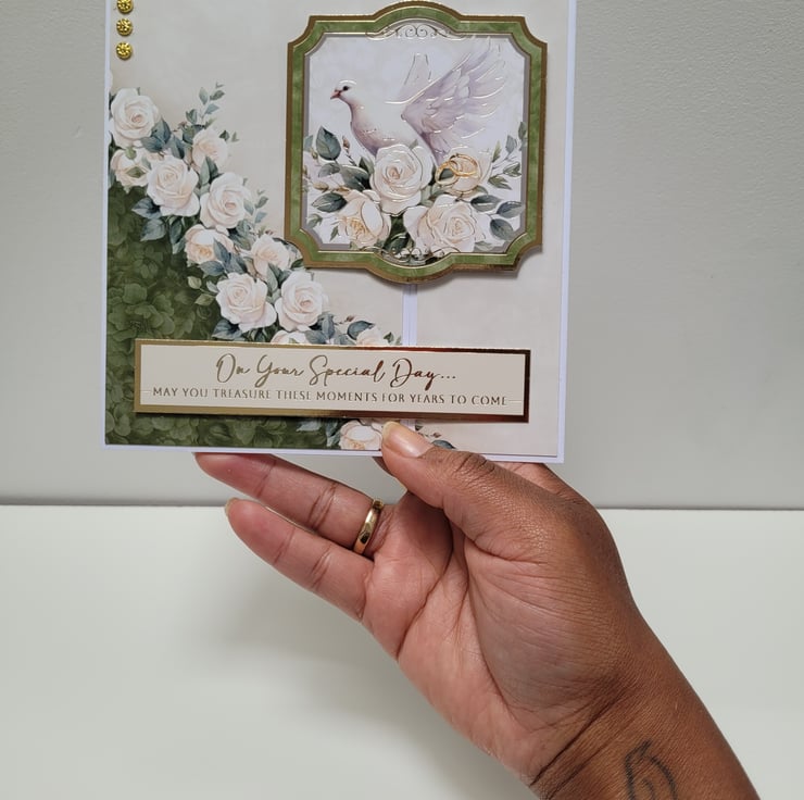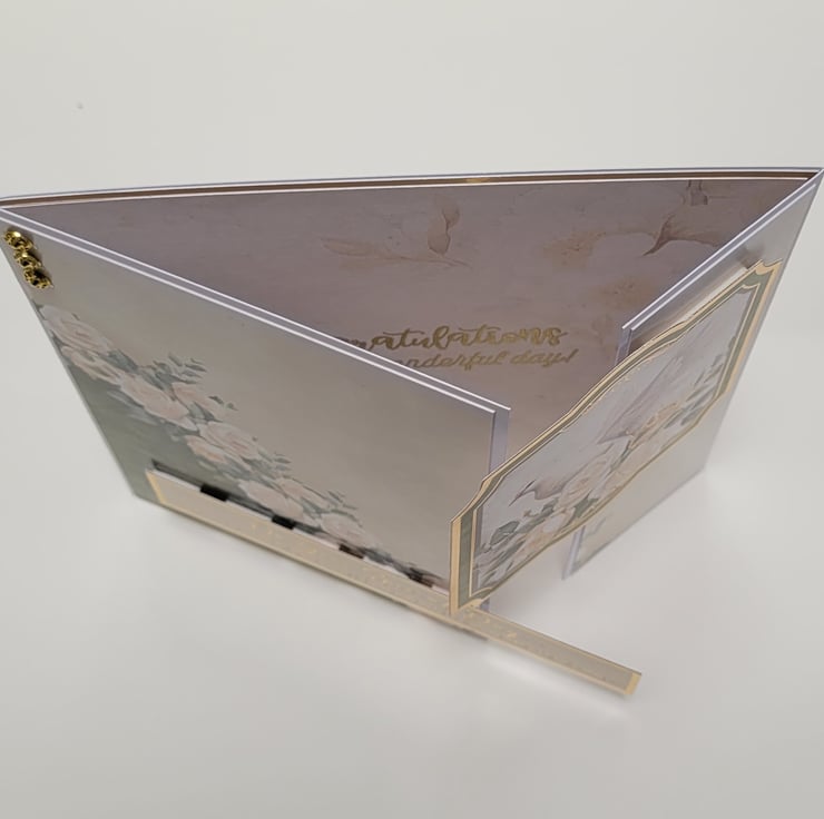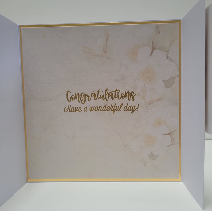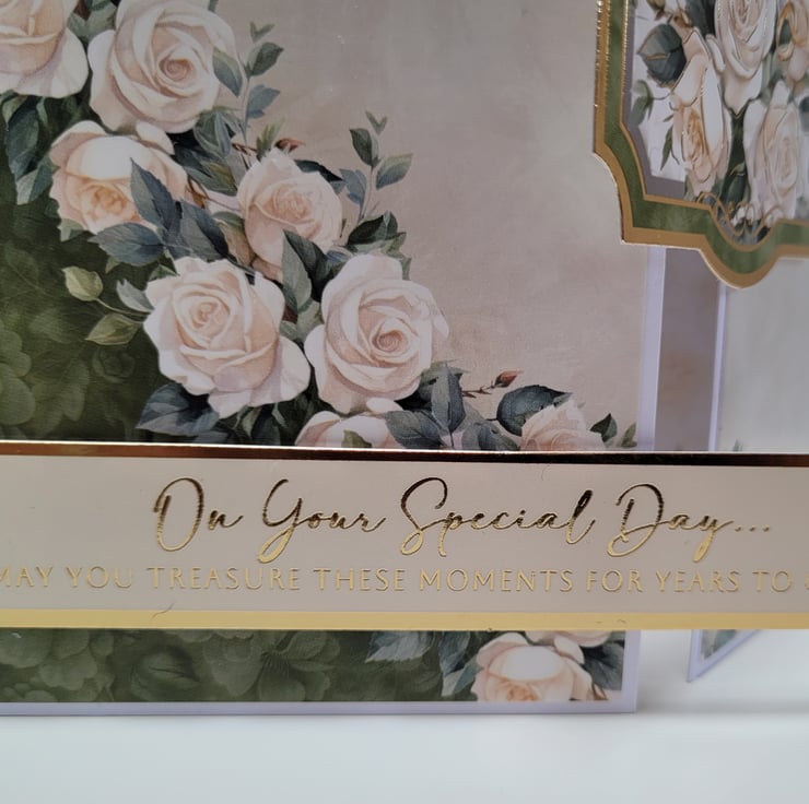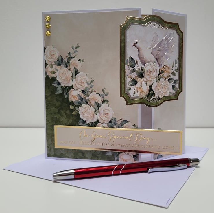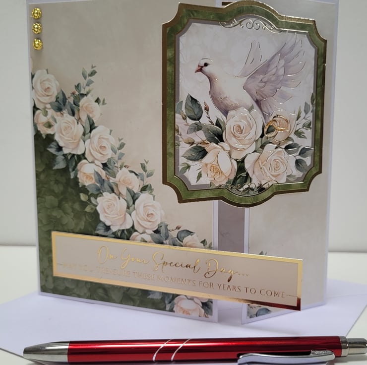 A beautiful wedding card made with quality heavy-weight printed cardstock, depicting a cascading rose cluster as well as a white dove and 2 gold wedding bands, in soft ivory, cream and green tones, complimented by gold mirror card and foiling accents.