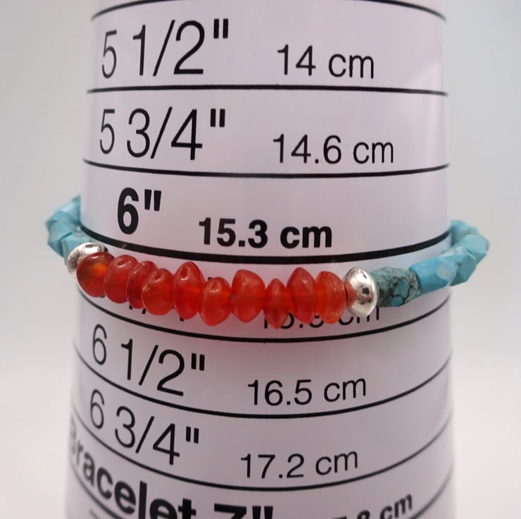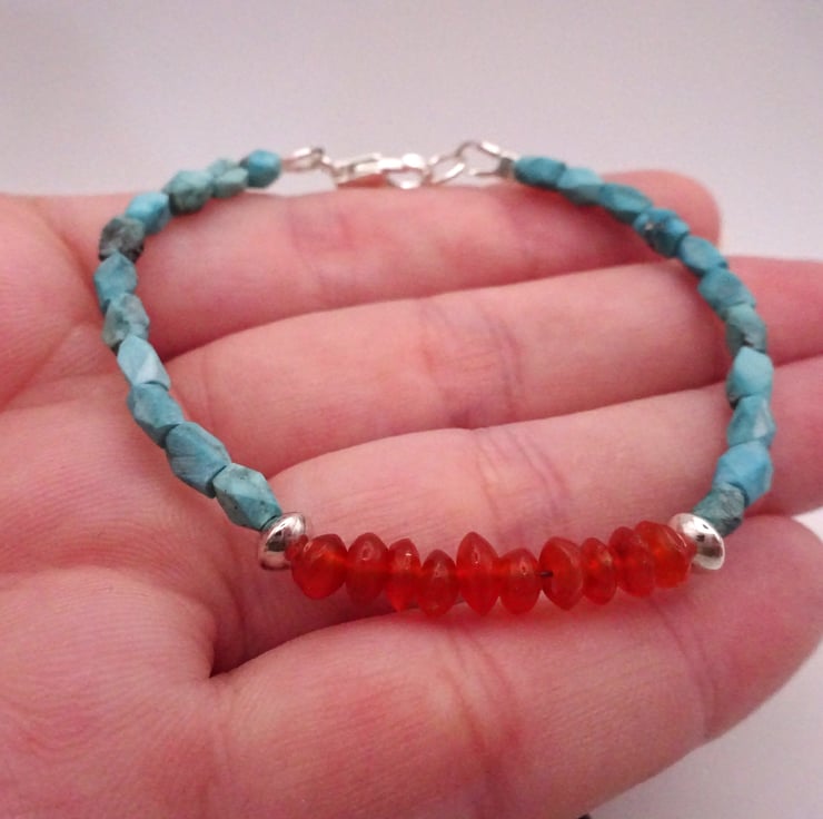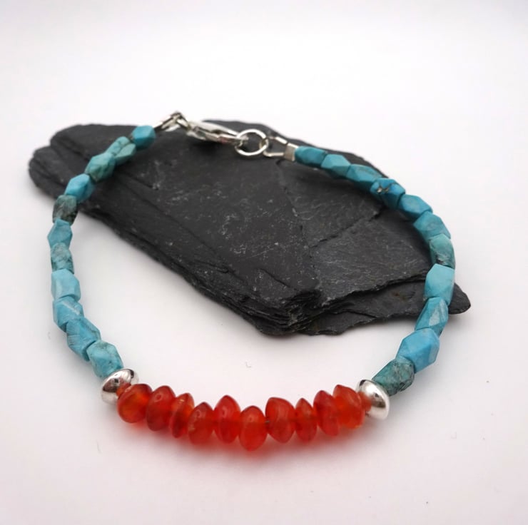 A beaded bracelet made with sterling silver bead and Persian Turquoise and Carnelian gemstone beads.