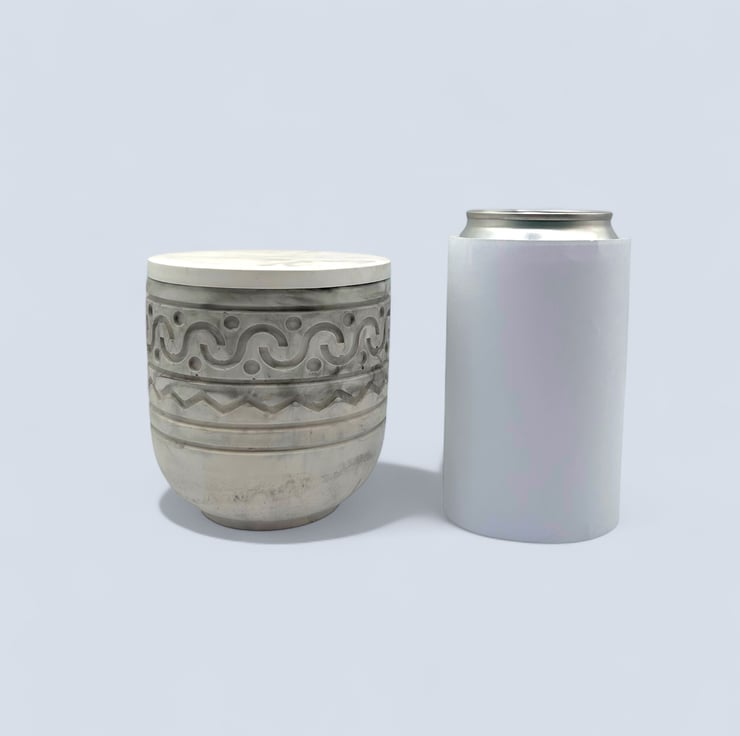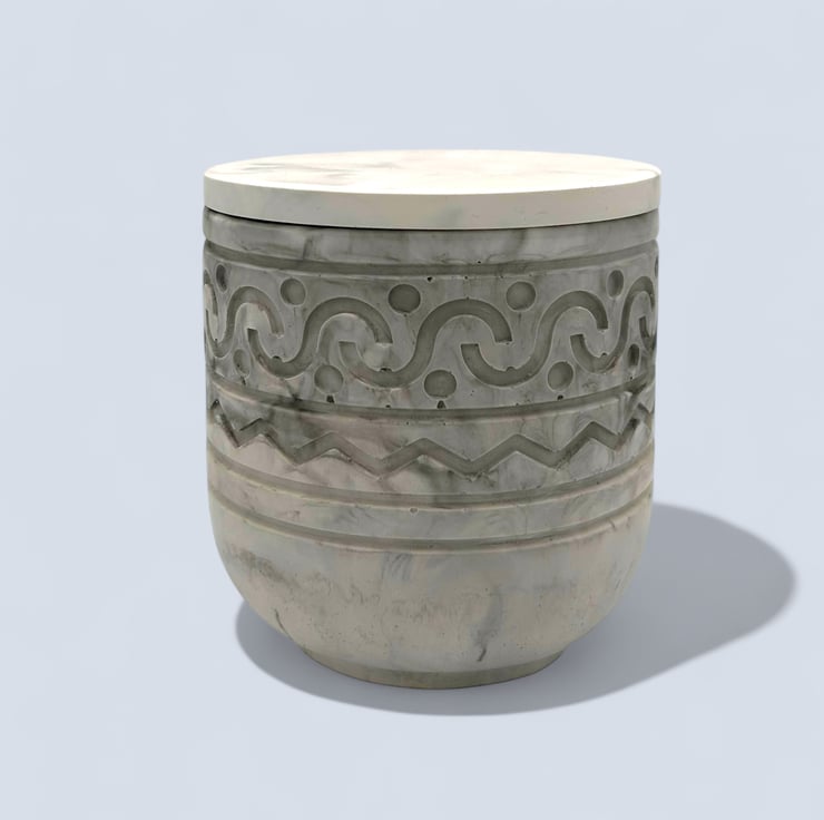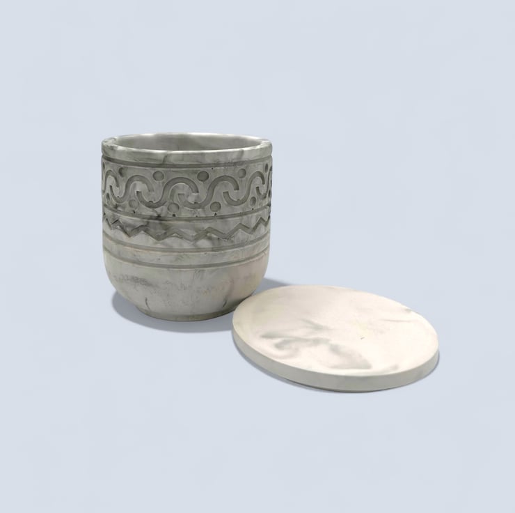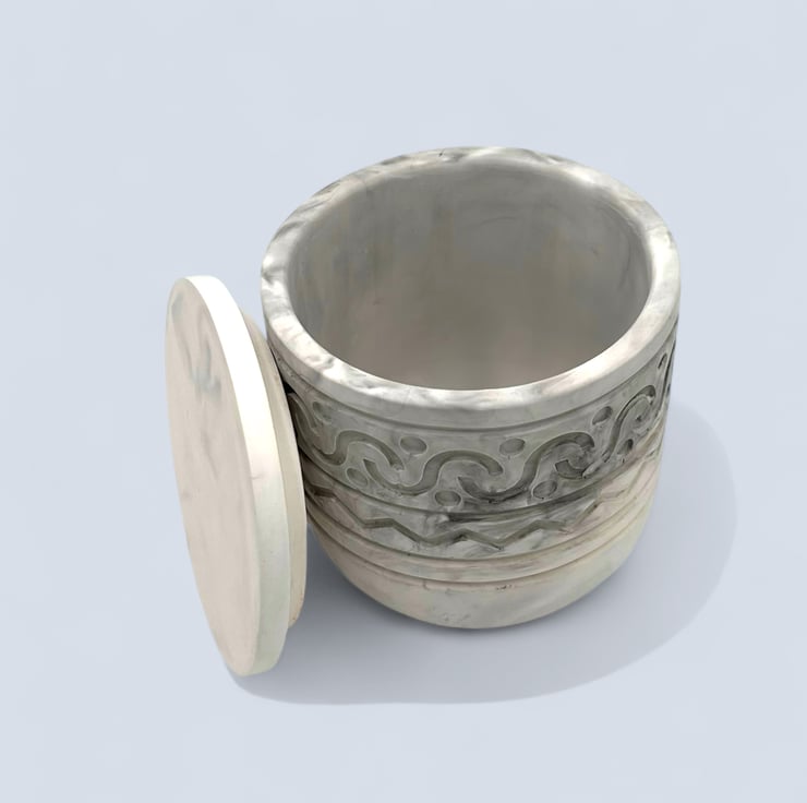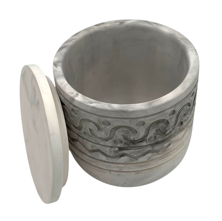 This trinket pot features a geometric design with lines, S-curves, circles around the upper part, and zigzag and straight lines lower down. I drew my inspiration from the elegance of marble to create this striking white and smoky grey marbled jewellery box. I crafted it from British Crystacast, giving it a lovely smooth and stone-like finish. This pot is perfect for storing keepsakes, trinkets, jewellery, or small treasures. Additionally, it can serve as a candle jar for tealights, candle sand or pillar candles; the lid can then function as a coaster to protect your surfaces from heat.
