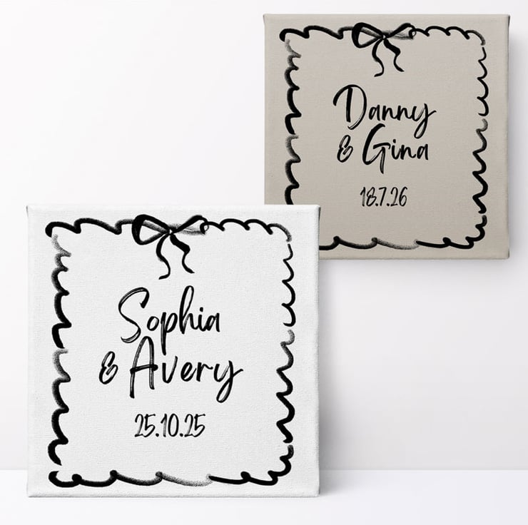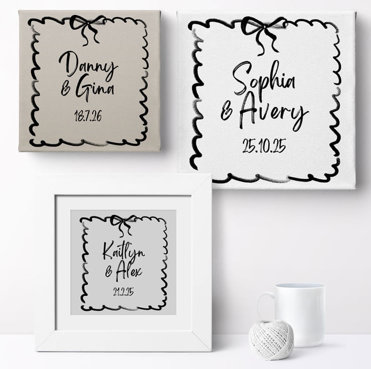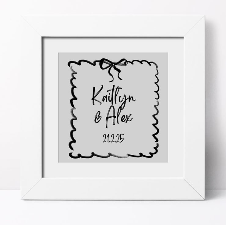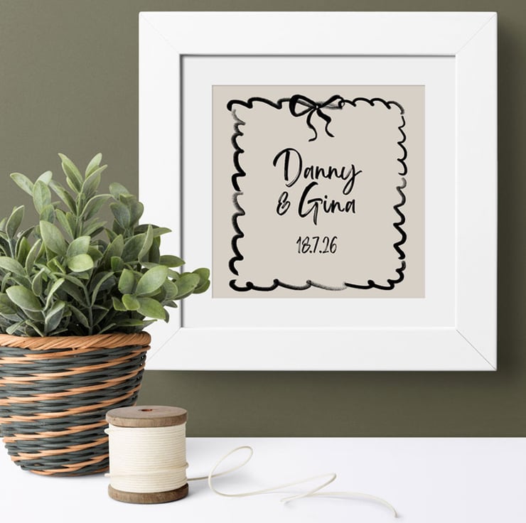 Add a splash of romance to any space with this contemporary 'Brushstrokes' design print. Featuring a gorgeous hand drawn bow border and soft calligraphy style wording, this stylish print is perfect for celebrating a special anniversary, Valentine's Day or wedding.