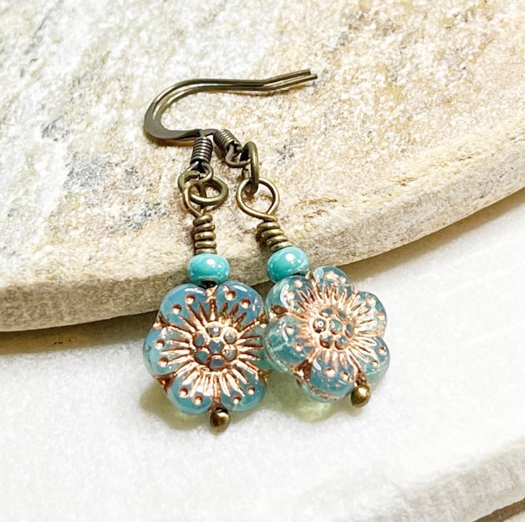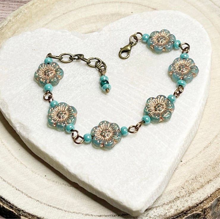 This jewellery set features handmade pieces created with matching aqua blue anemone flower beads. The beads are Czech glass in a soft transparent blue, accented with copper to bring out the floral details. Each piece is complemented by light sky blue seed beads and finished with bronze-tone elements, giving the set a subtle, boho-inspired feel.