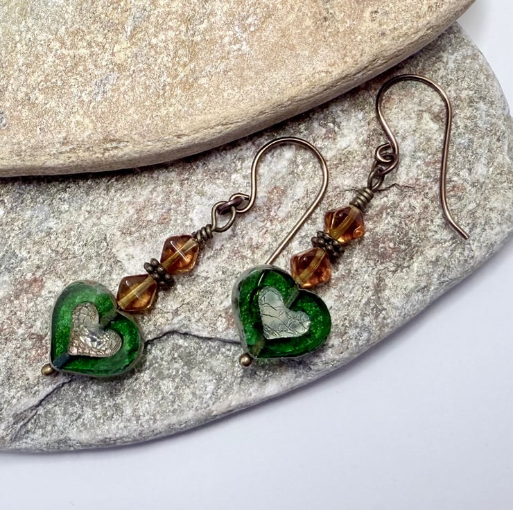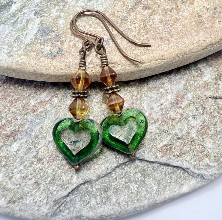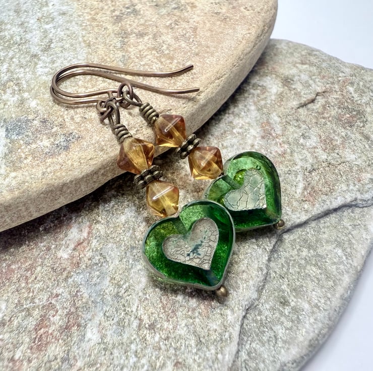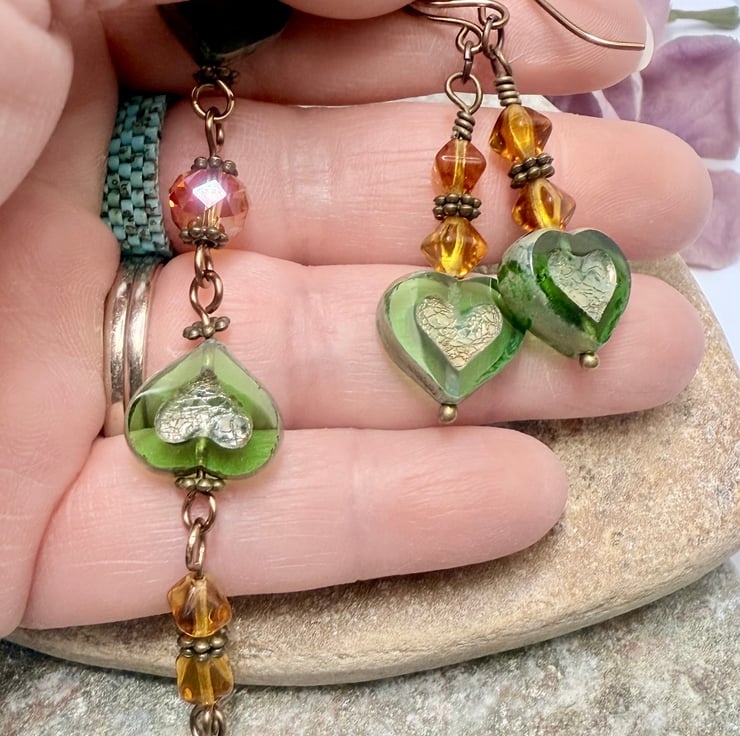 The earrings use the same emerald heart beads and golden bicone shaped beads to match the bracelet. They’re finished in bronze tones and hang from my own handmade ear wires.