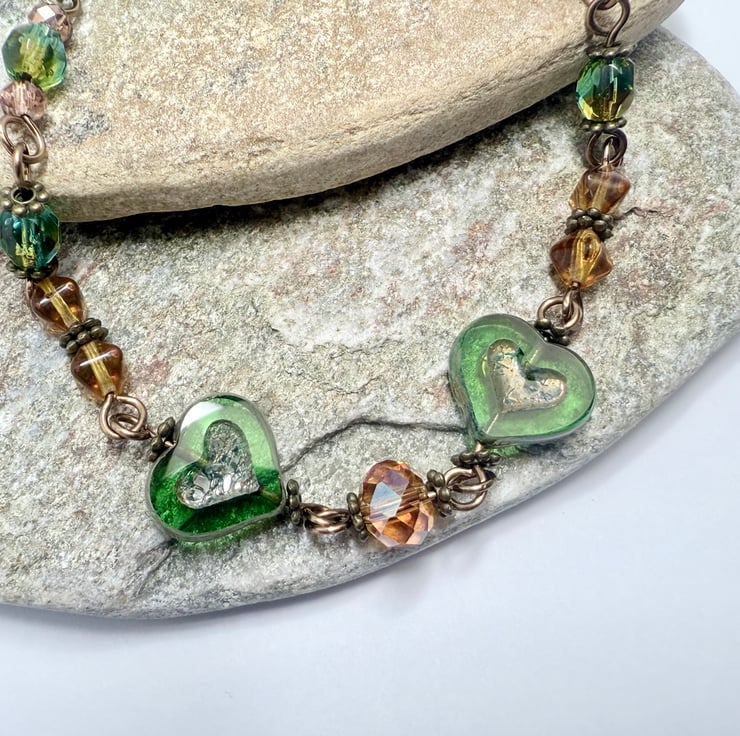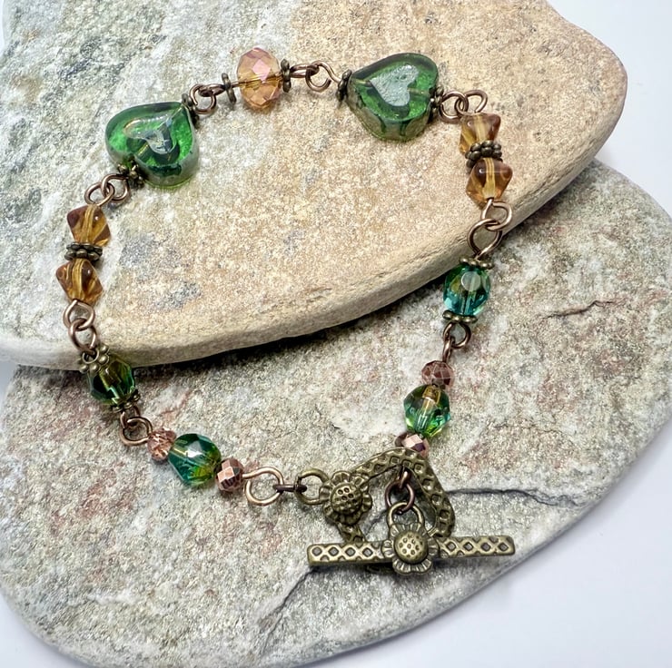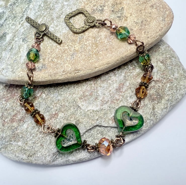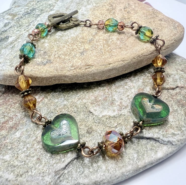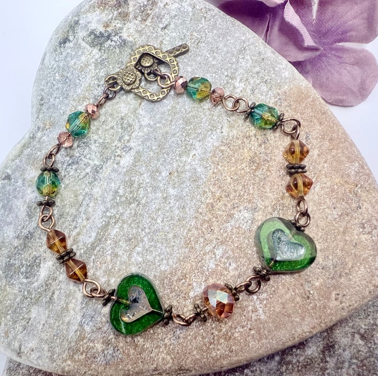 The bracelet features two chunky emerald green heart beads with an aged, vintage-style finish. These are paired with 5mm dark golden amber coloured bicone beads, 6mm two-tone green and mustard beads, 8mm faceted crystal, and 4mm rose gold faceted beads. The beads are arranged in an alternating pattern on handmade bronze wire connectors.