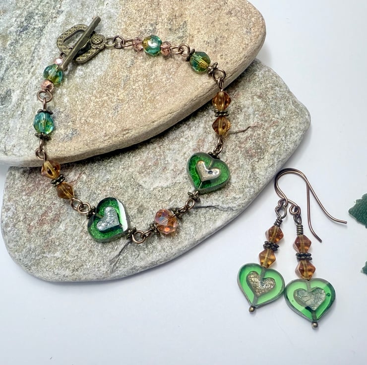 Handmade emerald green heart bracelet & earrings set, boho style matching set