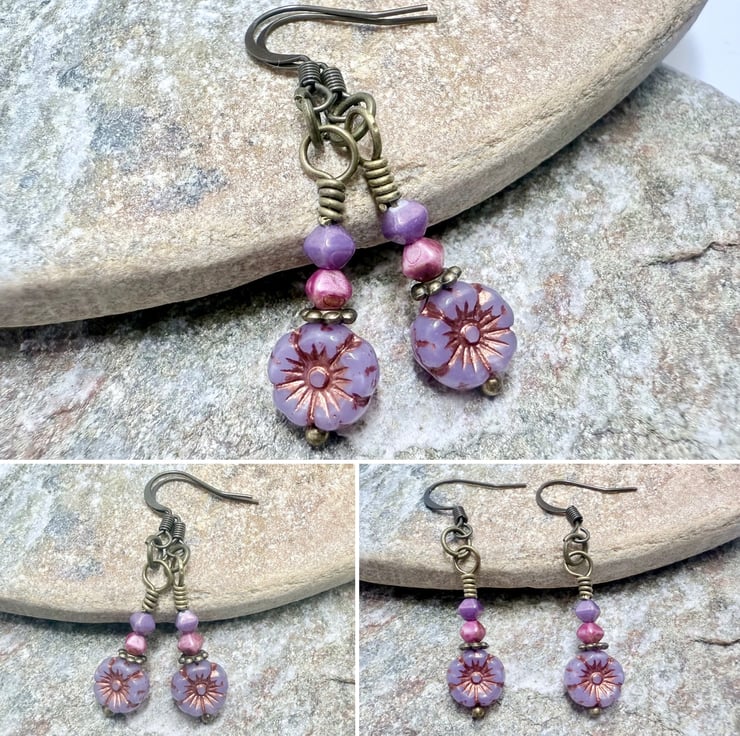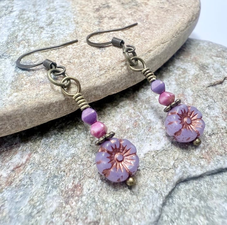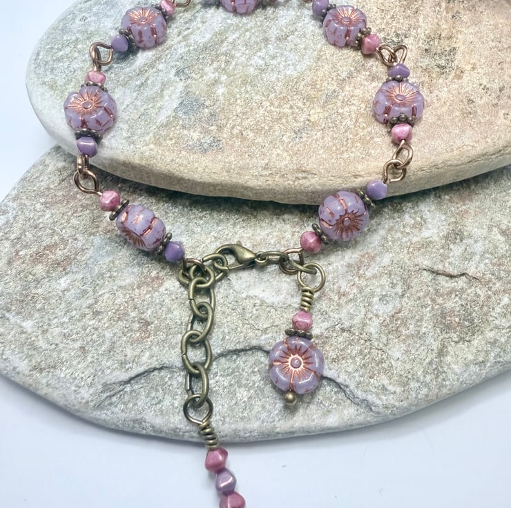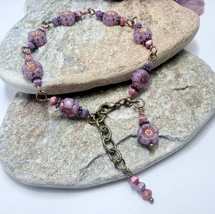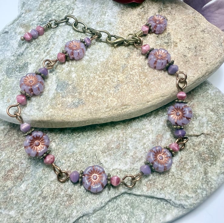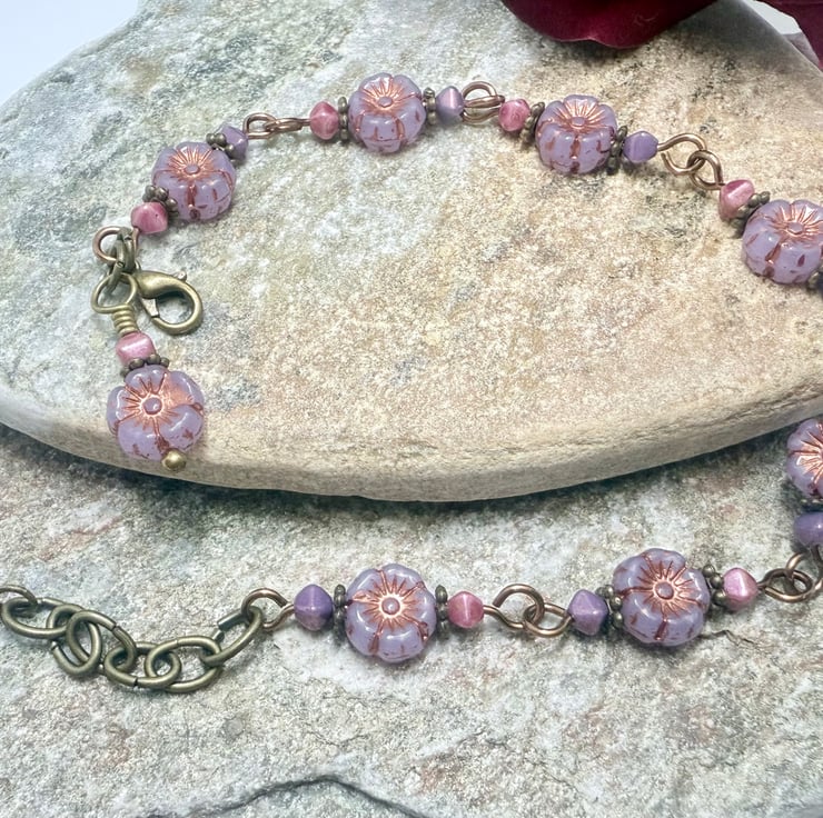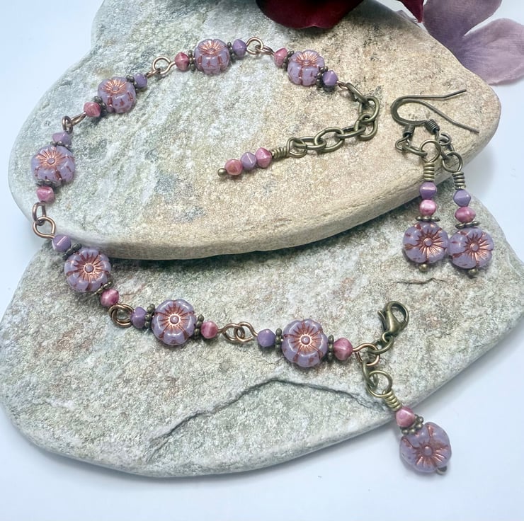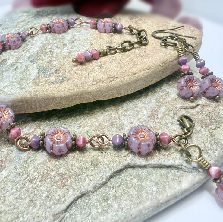 This floral bohemian jewellery set includes a dainty bracelet and matching earrings, both handmade using beautiful Czech glass beads. The small flower beads are a soft opaque lilac with delicate copper-toned detailing. They’re paired with shimmering purple and rose pink bicone beads to add a touch of shimmer and colour.