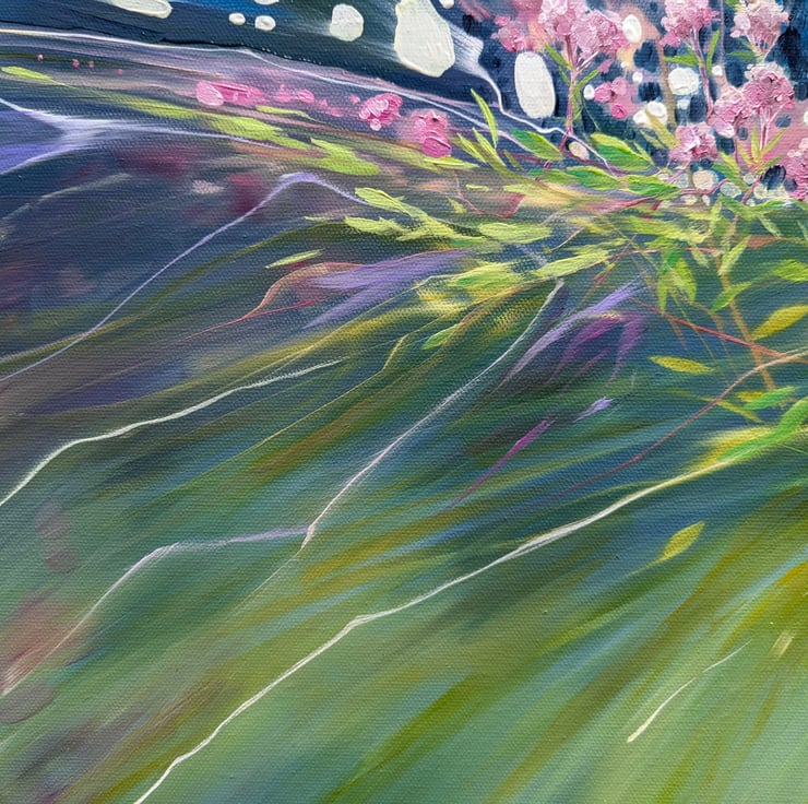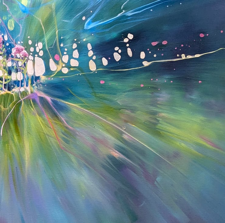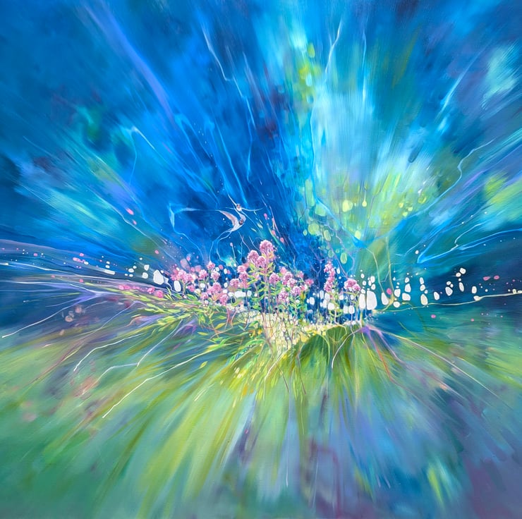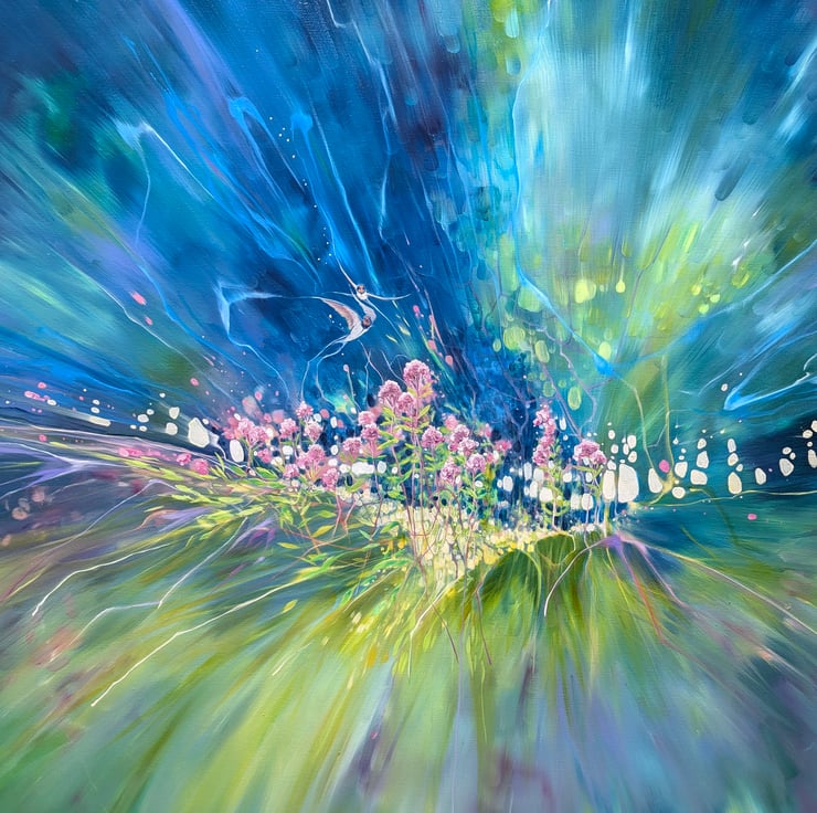 One Enchanted Summer is a multicoloured semi-abstract landscape painting of a summer meadow with trees and swallows. It is 48x36x1.5 inches. The painting looks entirely abstract from a distance as a myriad of colours burst outwards from the middle of the canvas in pinks, greens, purples, deep blues and yellows. When you look closer however, you see that there are two dancing swallows and pink wildflowers against a backdrop of dark trees with hints at fields beyond them through gaps in the branches. The inspiration for this painting was exploring the many nooks and crannies of the Mayfield and Burwash areas of East Sussex where the viewpoints change swiftly from the streams in the gullies to the rolling hills and small meadows and ancient trees shaped by sheep and deer and old houses and farms that retain their medieval flavour. I often feel I could come across portals to other worlds and enjoy this fantasy as I walk. I think I have conveyed this feeling well in this painting! Painted on deep edge canvas (edges painted to match the painting), ready to hang and comes with certificate of authenticity.