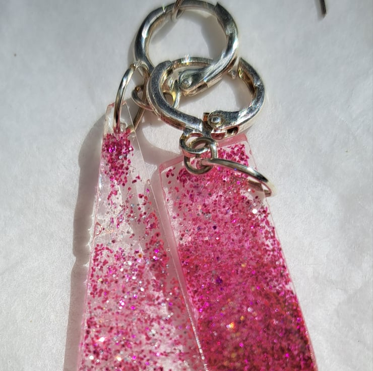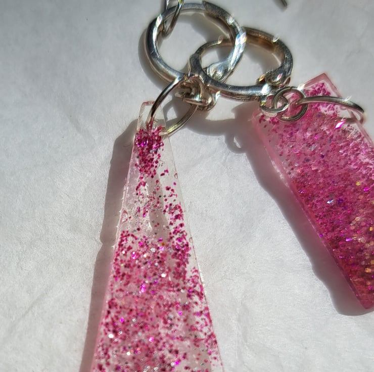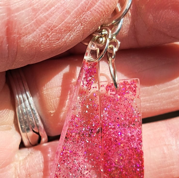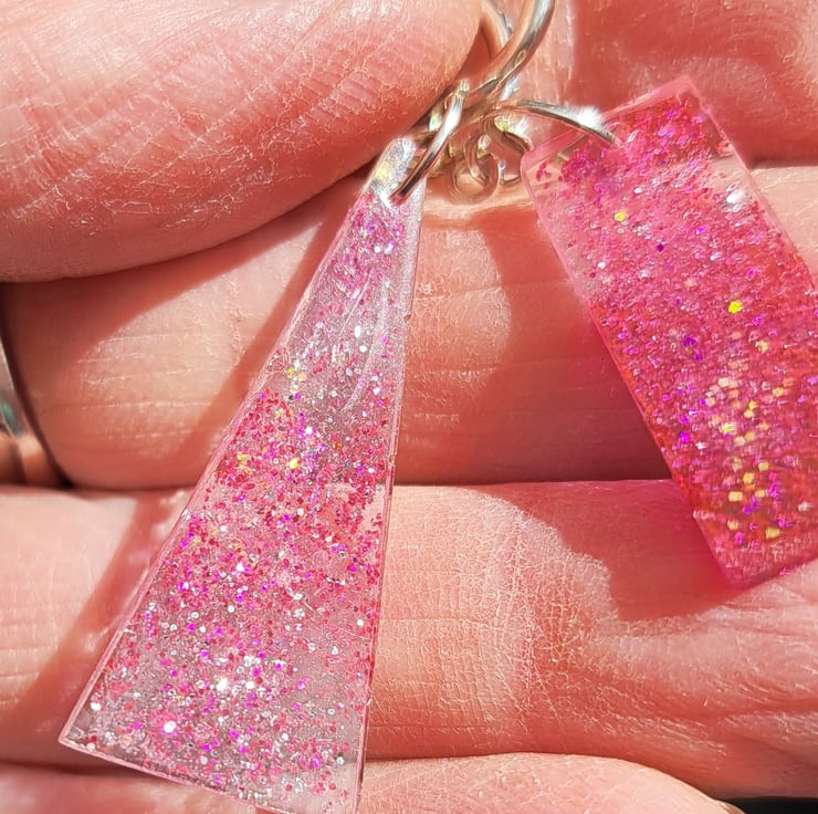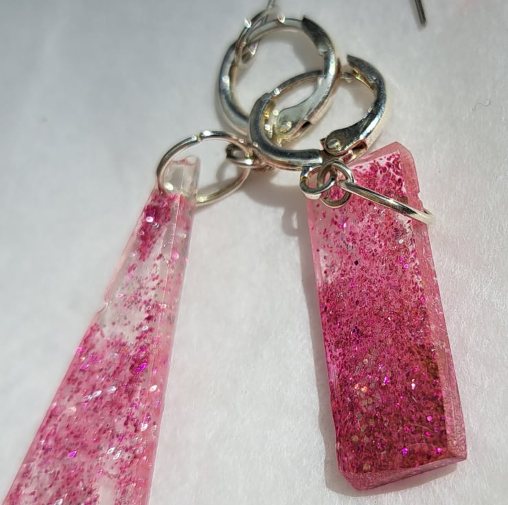 Hot pink resin earrings on a pair of hoop earring findings. Each piece has been set in a resin mould with sprinkles of pink glitter.