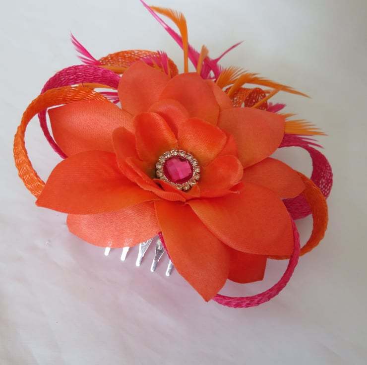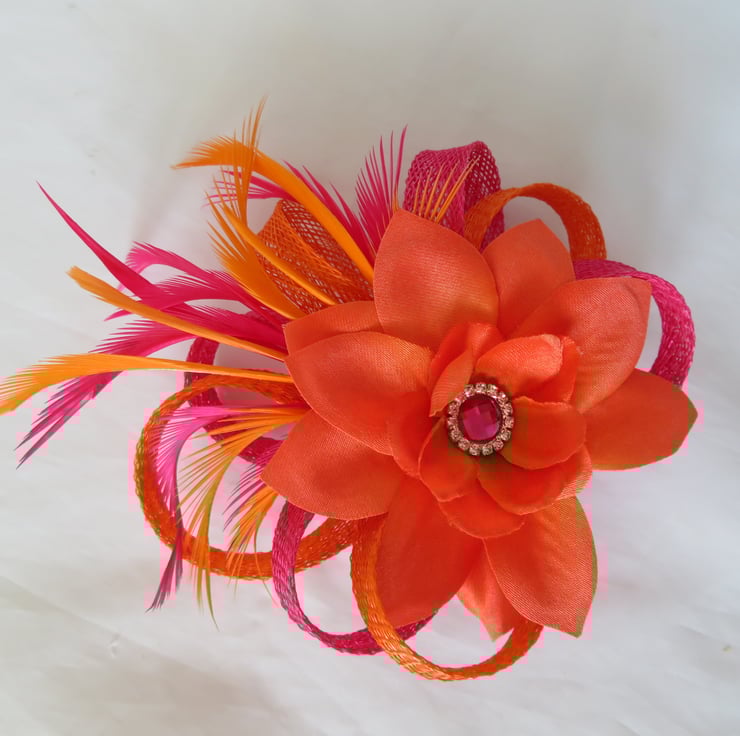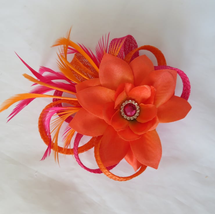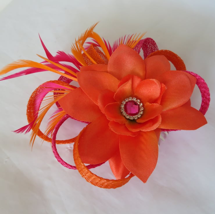 At the centre, an orange flower blossom with a sparkling fuchsia pink crystal and diamante stud which adds a lovely finishing touch.