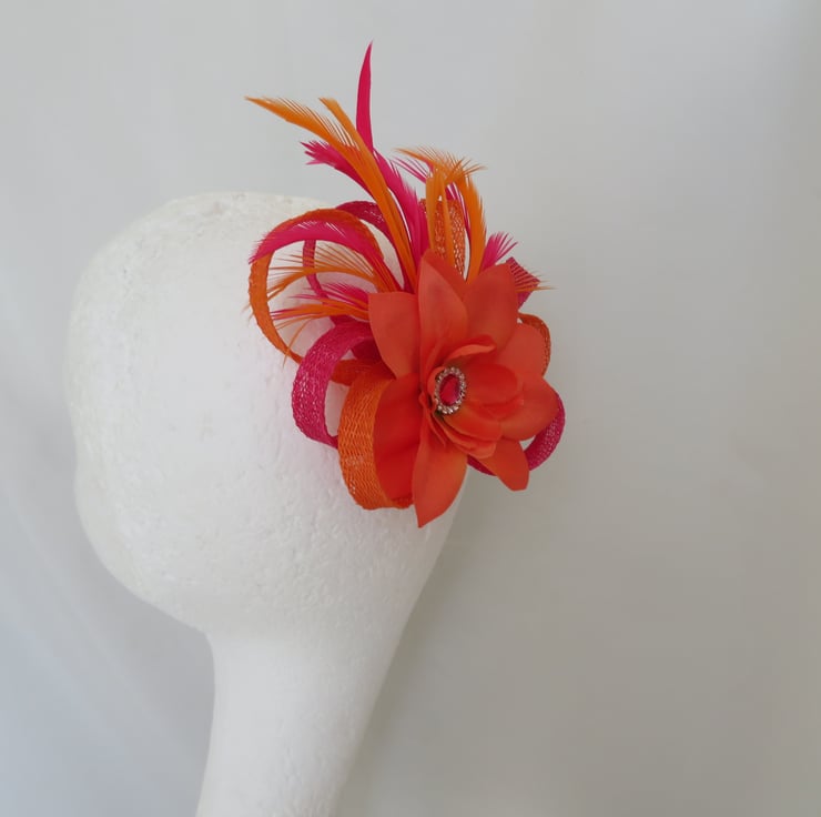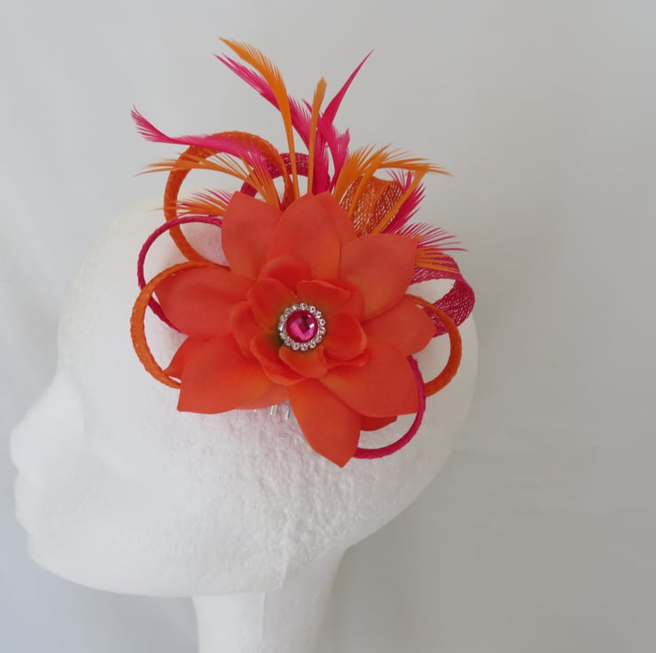 Bright Cerise Pink & Orange Sinamay Fascinator – “Roxi” Loop Style with Feathers & Blossom Accent