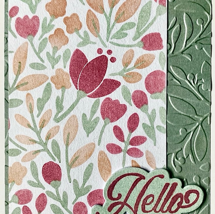 Send a cheerful “Hello” with this hand-crafted greeting card, perfect for brightening someone’s day. Each card is lovingly made using hand-stenciled floral patterns in fresh spring tones mounted on a sage green embossed background and finished with a hand-printed sentiment.