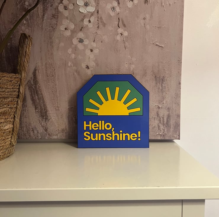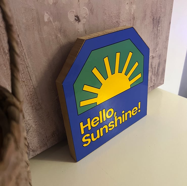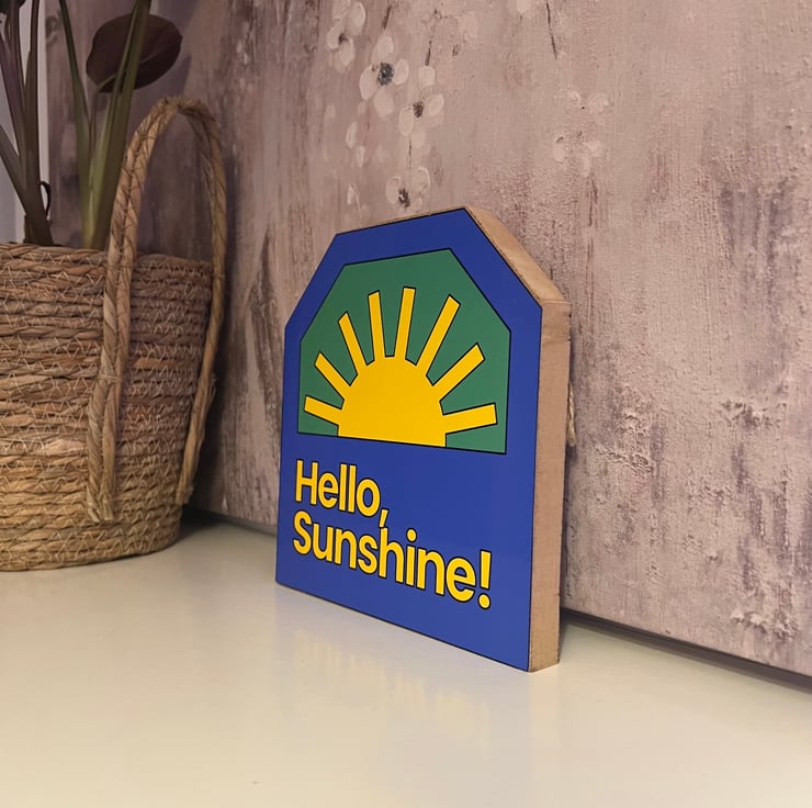 A colorful sunrise graphic, this freestanding plaque is perfect for kitchens, windowsills, desks, or anywhere that needs a pop of positivity. Made from sturdy wood with a smooth, glossy finish. A great gift or decor piece for sunshine lovers!