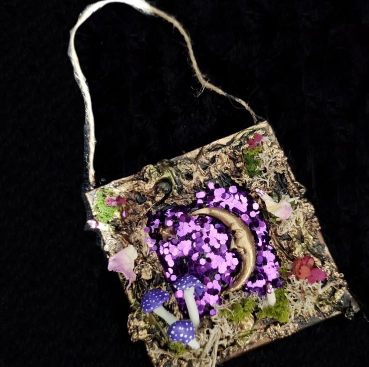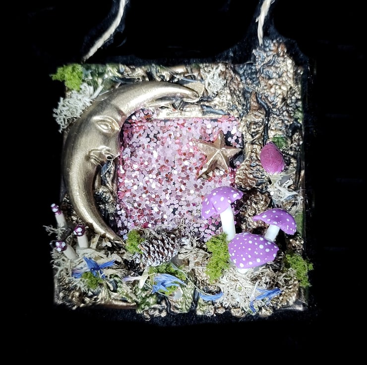 Mache Picture frames have been made into a Bark effect painted then decorated with handmade Shrooms, Moss and different forest materials. The Skies are made from the Glitters with Stars and Moons