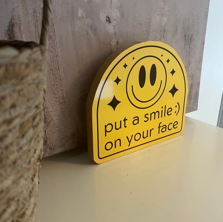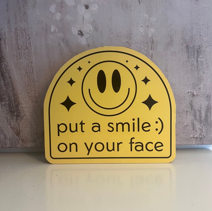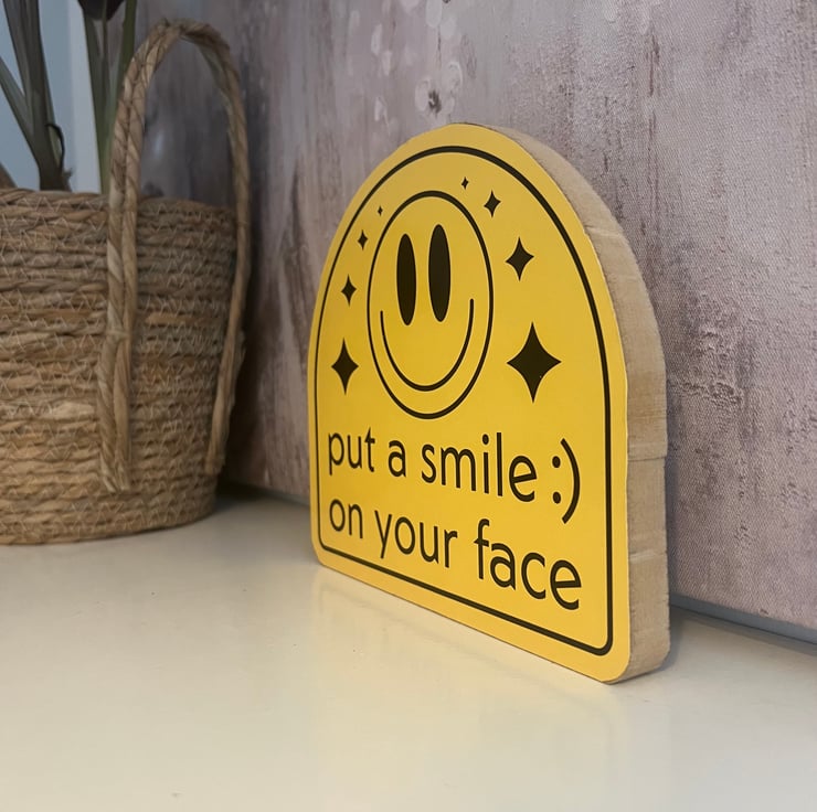 Bright and cheerful wooden sign with a smiley face and the message: “put a smile :) on your face”. Finished in bold black and yellow, this freestanding plaque is perfect for brightening up a desk, shelf, or gift hamper.