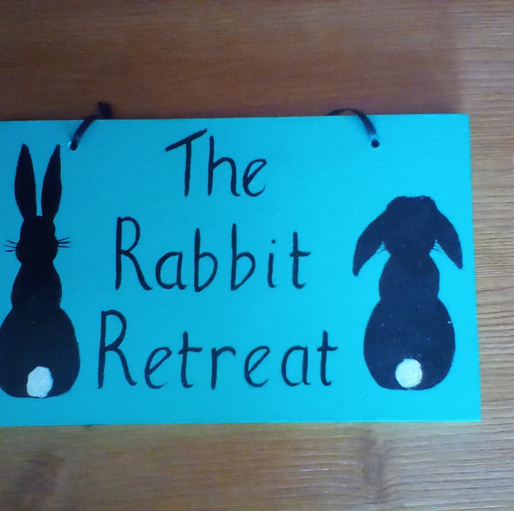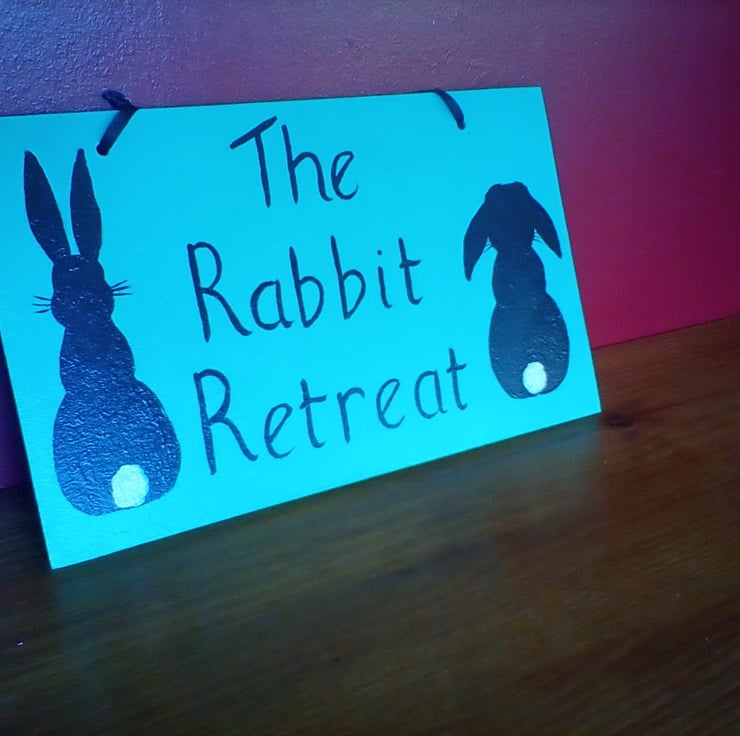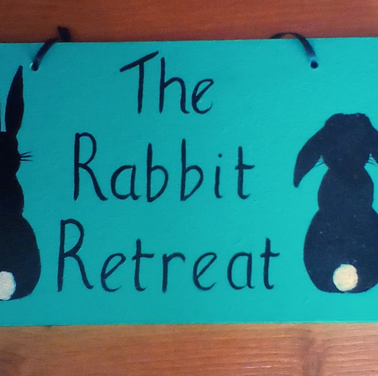 A pet sign, featuring two bunnies and decorated with the text The Rabbit Retreat.