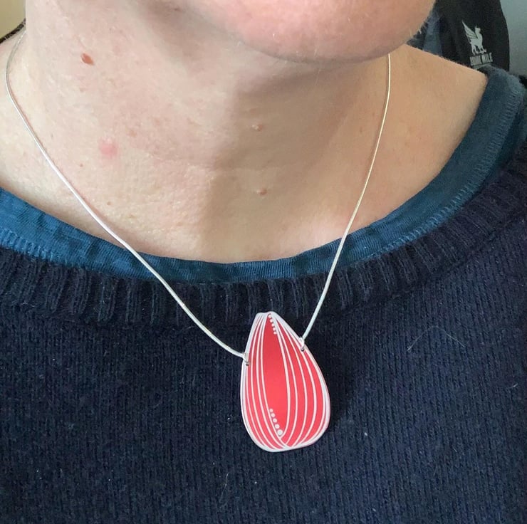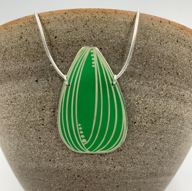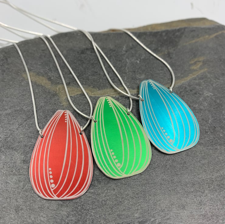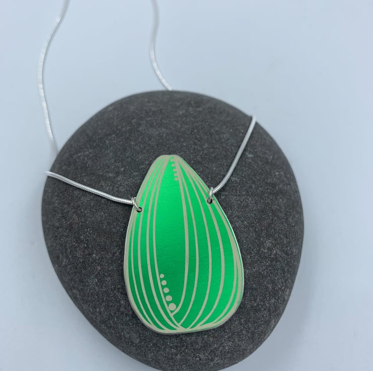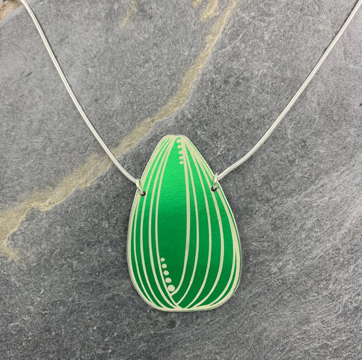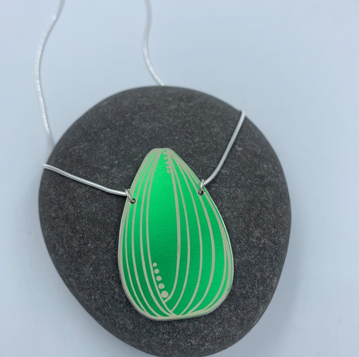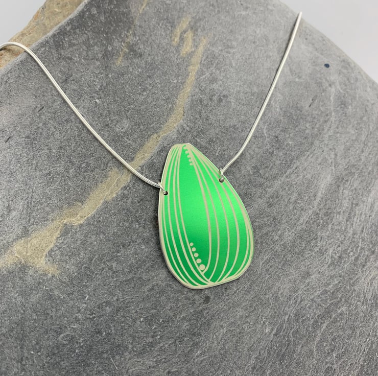 A stunning spring green stylised tulip pendant made from anodised aluminium. The hand drawn design has been etched into the surface of the metal. Inspired by the Art Nouveau period this unique piece measures 4cm in length and 2.5cm at its widest part.
