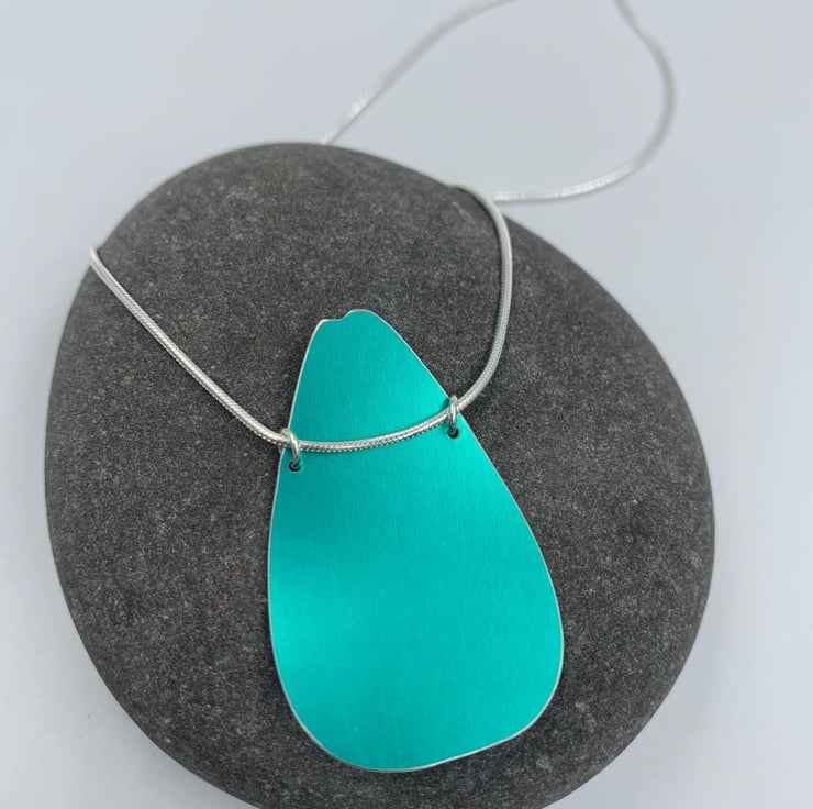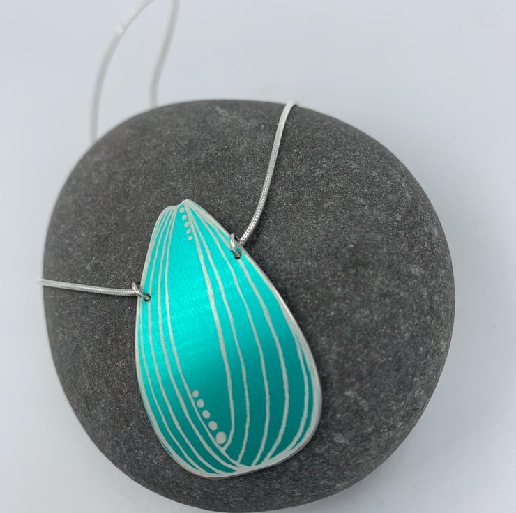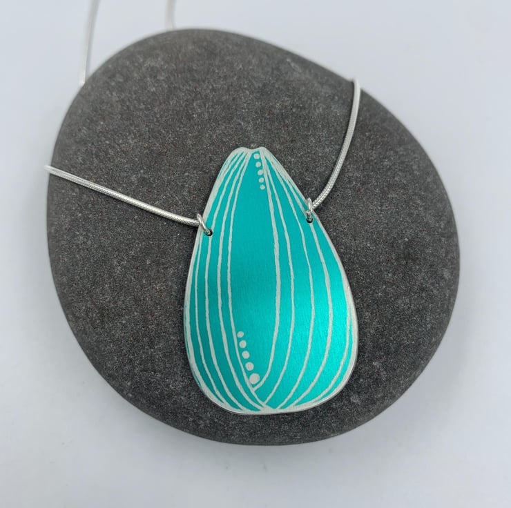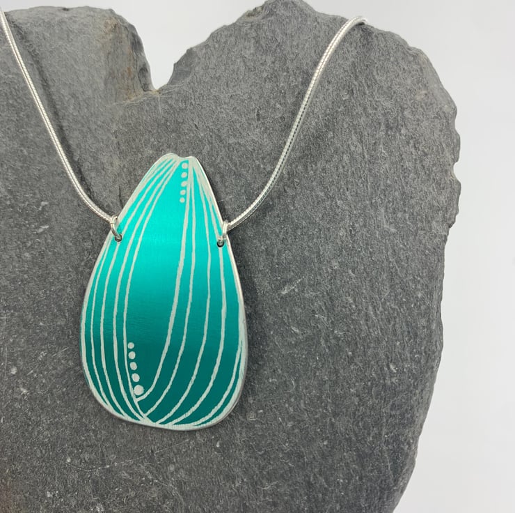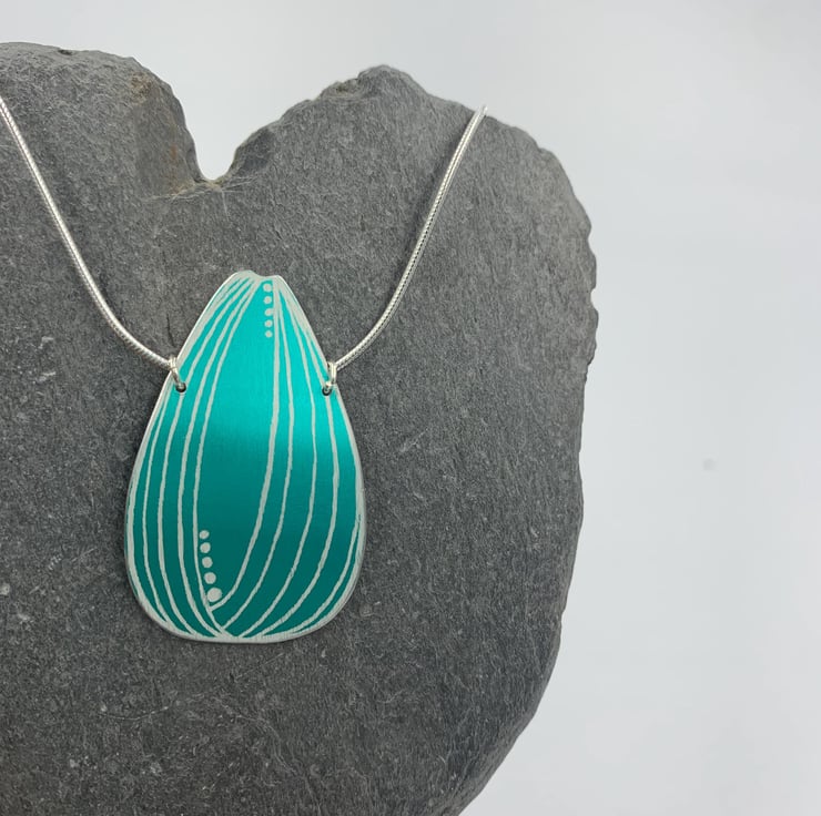 A stunning teal stylised tulip pendant made from anodised aluminium. The hand drawn design has been etched into the surface of the metal. Inspired by the Art Nouveau period this unique piece measures 4cm in length and 2.5cm at its widest part.