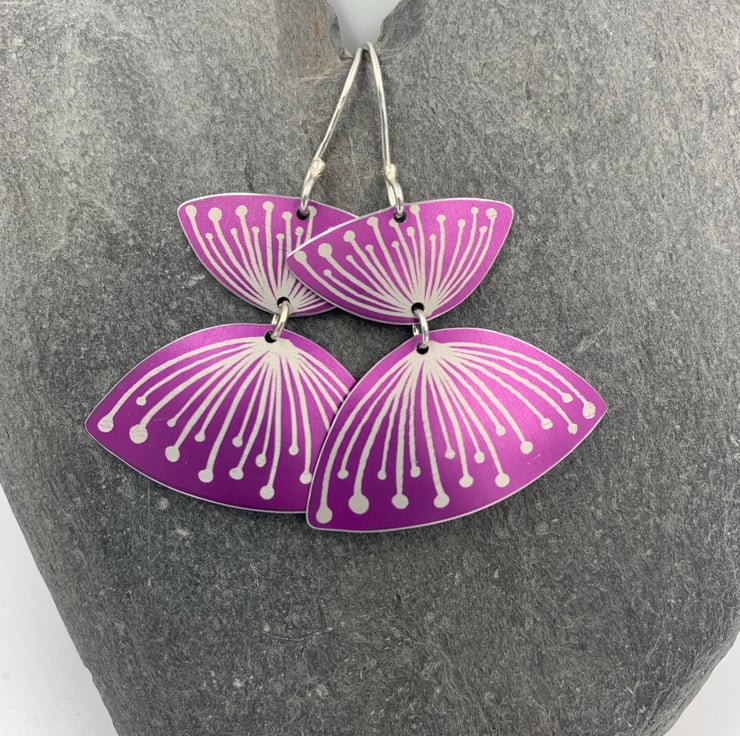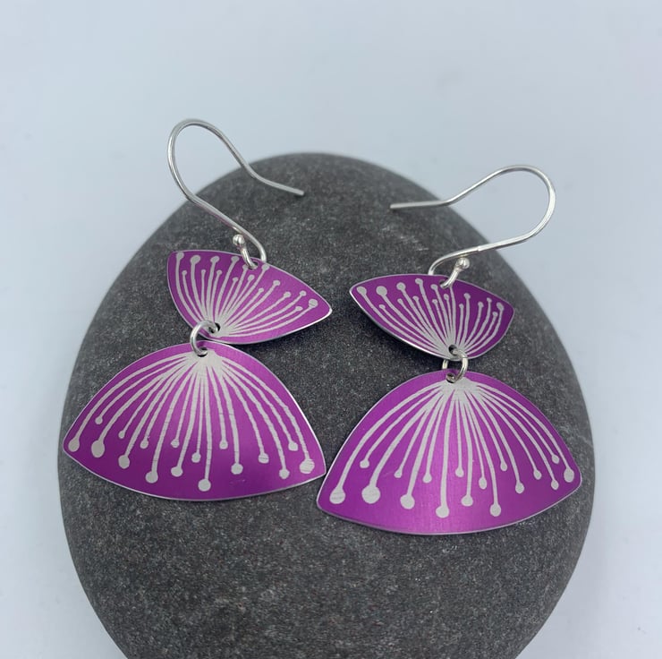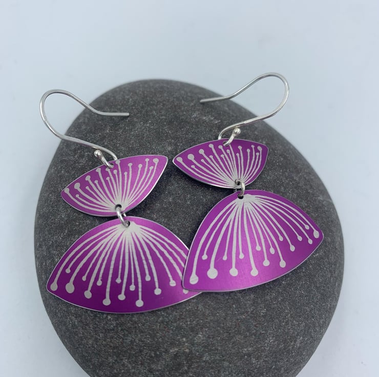 These handmade, dark pink aluminium seed head earrings feature a laser etched seed head design. This was drawn by me before being etched onto beautiful cerise anodised aluminium.