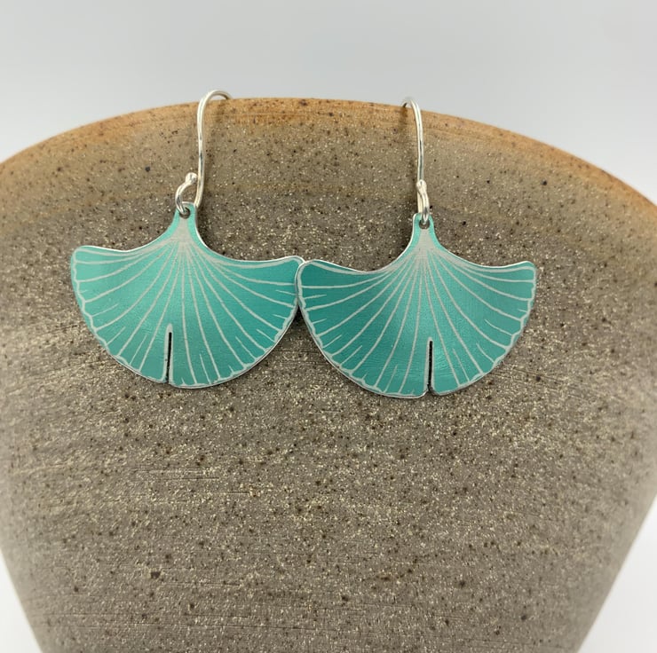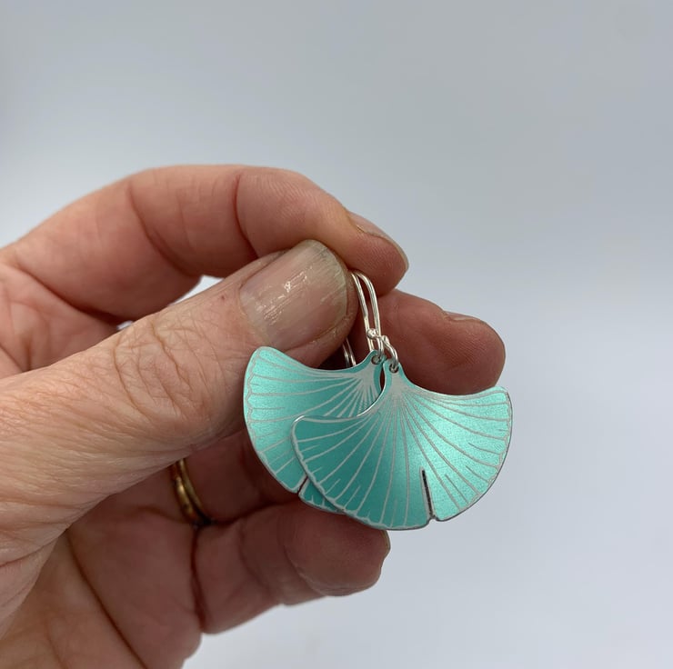 Beautiful teal ginkgo leaf earrings made from lightweight anodised aluminium. The hand drawn leaf design has been laser etched into the dyed metal, before being pierced out by hand. The earrings hang from hand made sterling silver ear hooks and measure 3cm in width and are 2cm long.