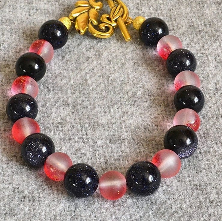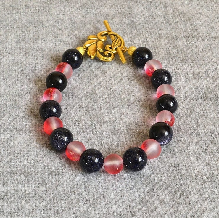 A simple but bold bracelet, with a good dose of sparkle. The bracelet features 10mm blue goldstone beads and 8mm frosted glass beads with a partial red coating and a little glitter. The bracelet measure approximately 21cm, or 8 1/4 inches, and is finished with a gold-plated toggle clasp.