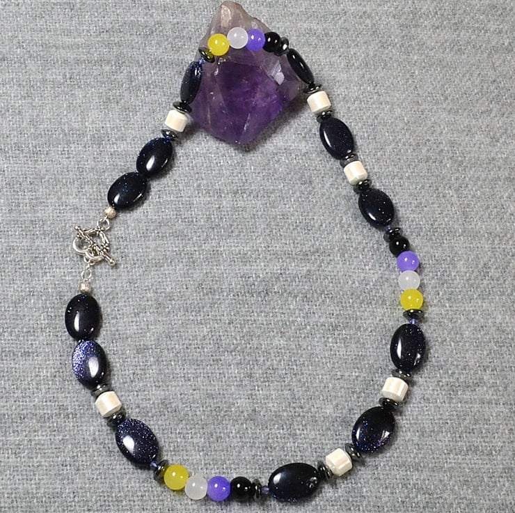 This is a shiny addition to this year’s Pride collection. The glass nonbinary pride flags are set among a riot of sparkle and shine. Pearlescent white magnetic hematite barrel beads, and shiny hematite rondelles, sit alongside sparkly blue goldstone ovals and tiny purple crystal bicones. It’s a statement piece.