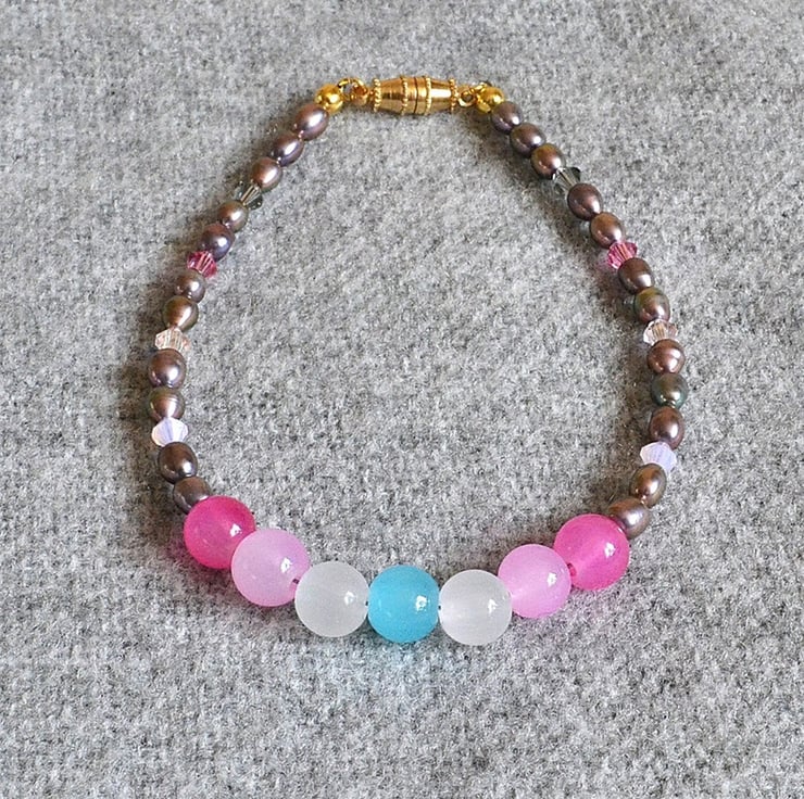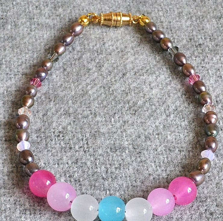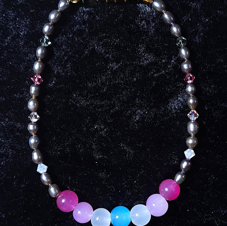 This is a delicate and pretty bracelet. The iridescent pink-grey oval glass pearls compliment the glass femboy pride flag beads beautifully. The tiny crystal bicones in smoky grey and three shades of pink, add a little sparkle to the piece.