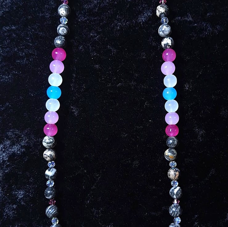 Femboy Pride Necklace with Glass and Grey-Marbled Stone Beads and Tiny Crystals