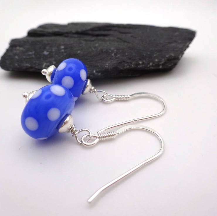 A pair of earrings made with sterling silver ear wires and handmade lampwork glass blue and white polka dot beads.