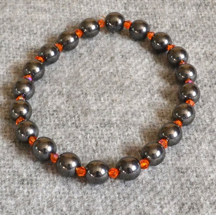 This is a contender for the shiniest thing I’ve ever made. The 8mm gunmetal glass beads have the look of hematite, with a similar level of shine. Peeking out from between them, the bright orange crystal bicones have an AB coating that gives them and extra rainbow sparkle.