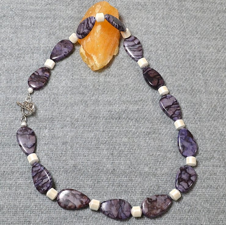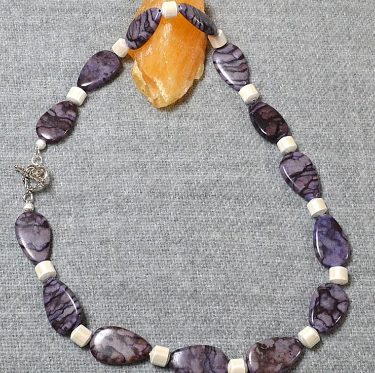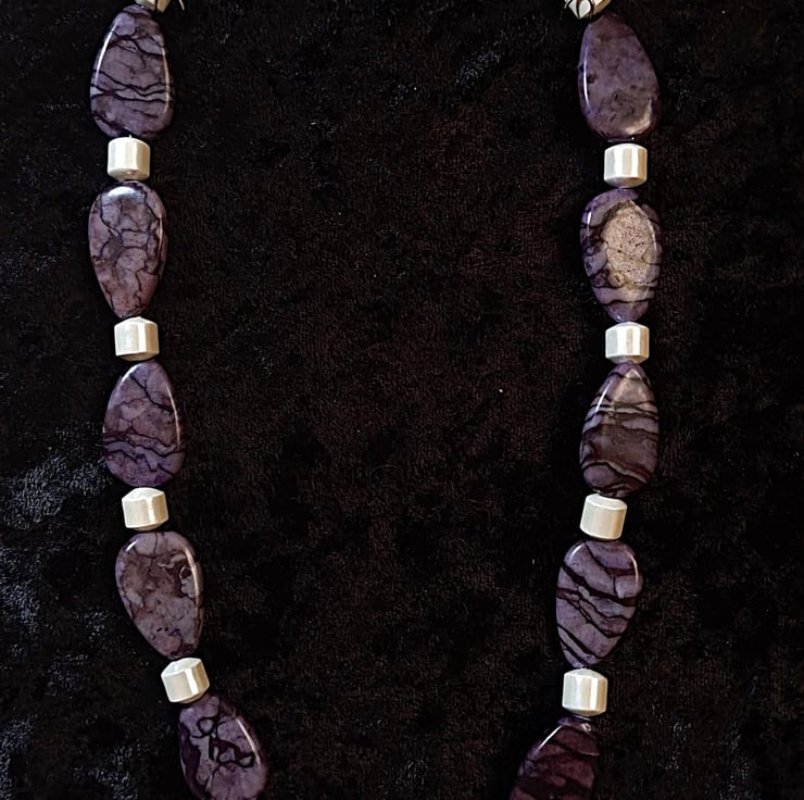 The rich marbled purple of these oval stone beads pairs beautifully with the pearlescent magnetic white hematite barrels. The necklace is approximately 49.5cm, or 19 1/2 inches, and is finished with a silver-plated toggle clasp.