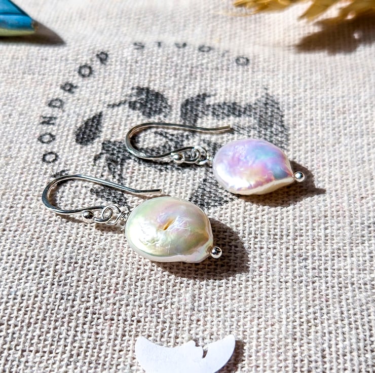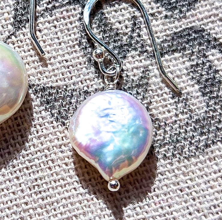 The pearls are baroque, coin-shaped, and totally unique, with an incredible natural lustre that catches the light beautifully. They shimmer in the light with soft pastel colours like lilac, gold, and icy blue.