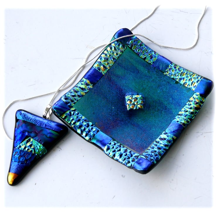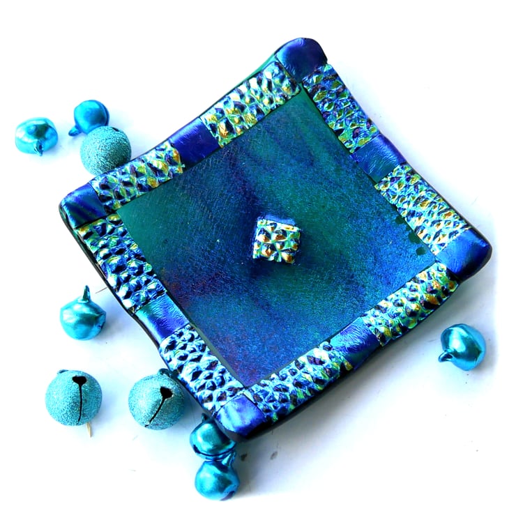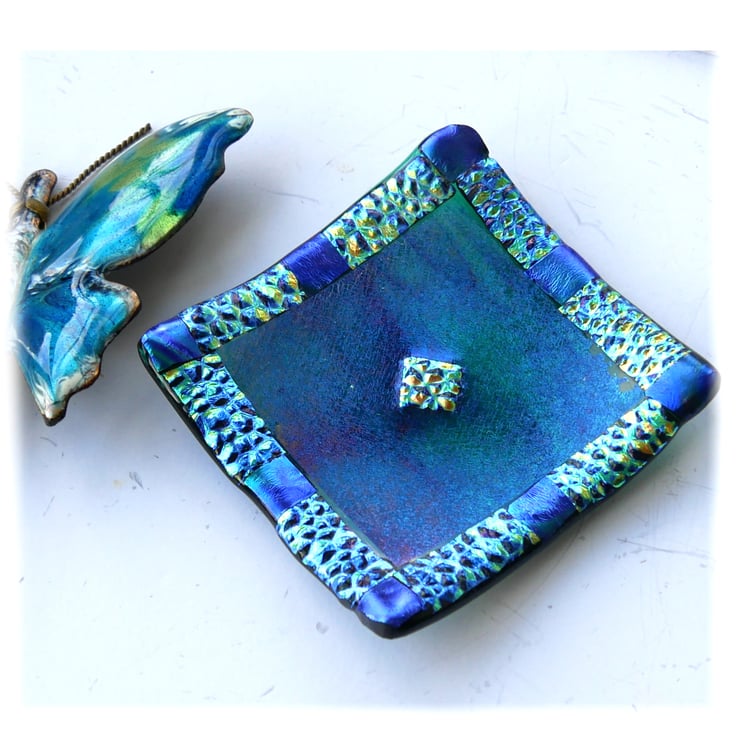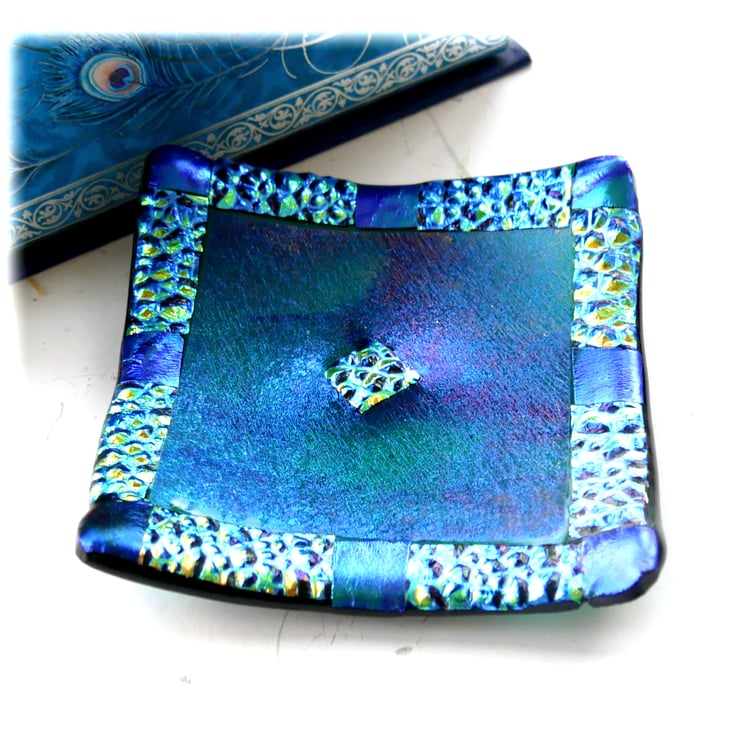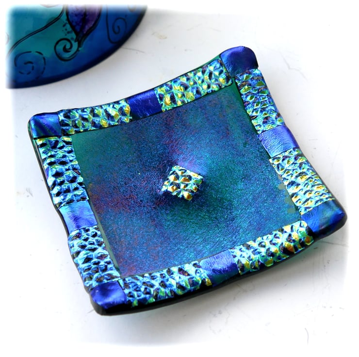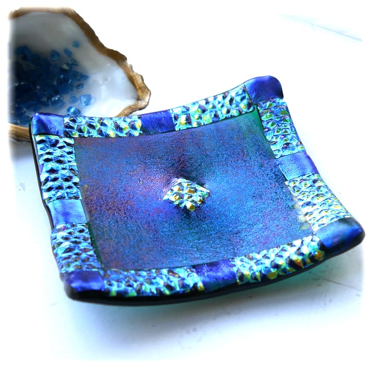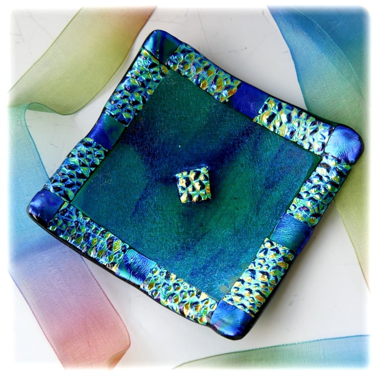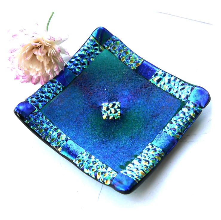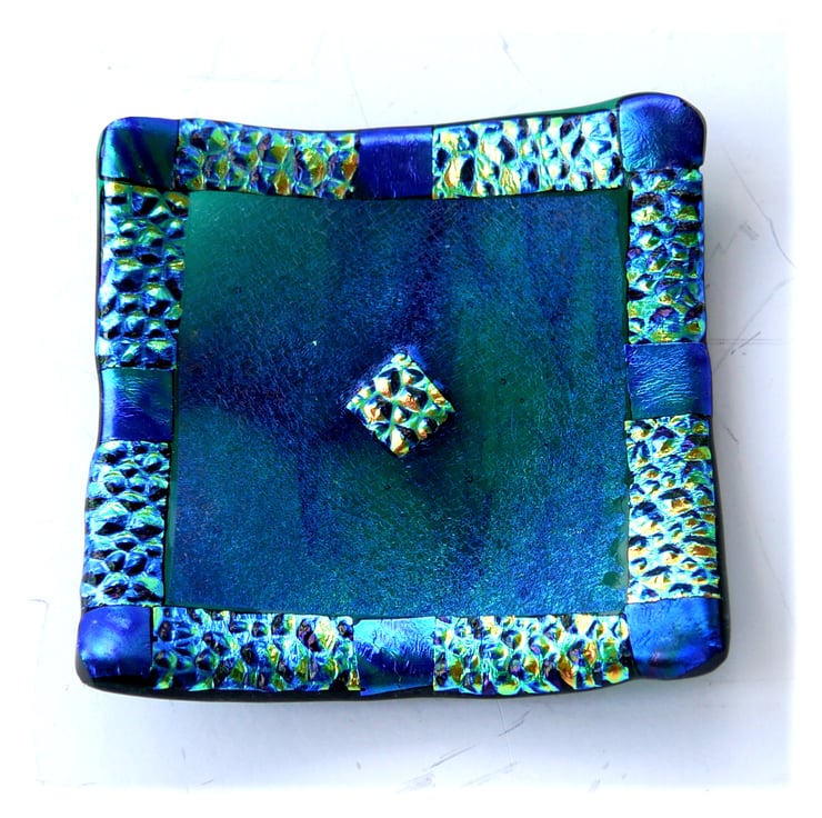 The base is brright emerald, the top layer clear and streaky navy blue with an iridescent sheen. Then a border comprising 2 types of gorgeous dichroic glass, one prettily textured.