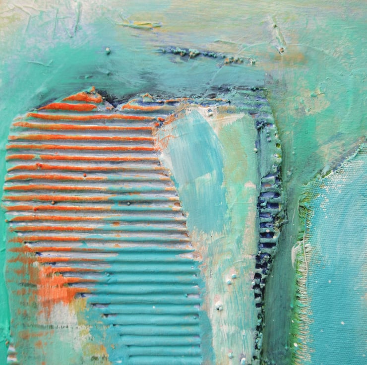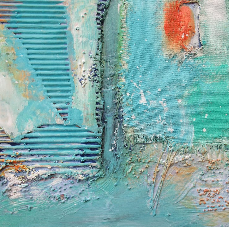 Beautiful, textured, abstract painting in acrylic and collage, on a 25 x 25 cm (9.75 x 9.75 inch) wood block with 1 inch deep edges and hanger on the reverse, based on coastal colours & themes. The sides of the work are painted so no framing is required - just unpack and hang. With an attractive colour palette and interesting texture, colour nuances, it will be hand signed on the front by Bea before dispatch and comes with a certificate of authenticity.